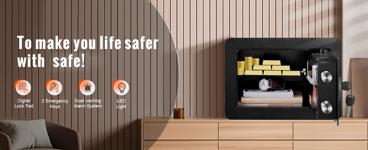 Unser Tresor bietet maximale Sicherheit durch sein duales Schließsystem, das ein digitales Passwort-Pad und zwei Notfallschlüssel umfasst. Sie können beruhigt sein und wissen, dass Ihre Sachen sicher und geschützt sind.