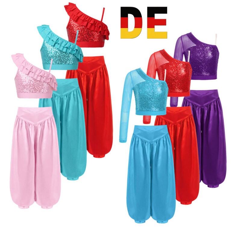 DE iEFiEL Mädchen Bauchtanz Kostüm Pailletten Crop Top +Hose Fasching Karneval