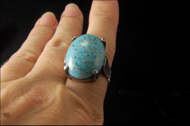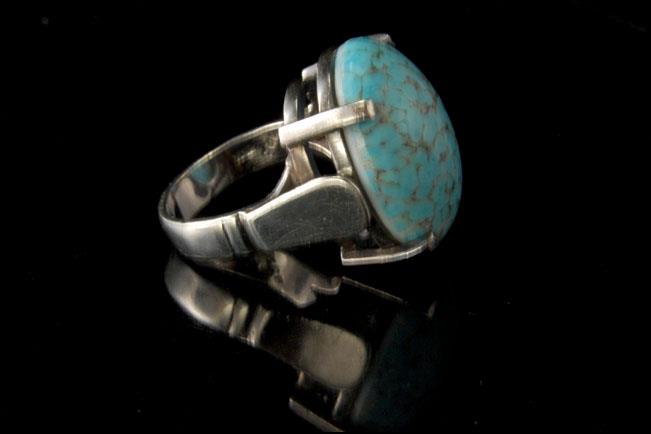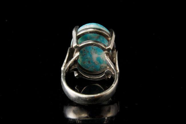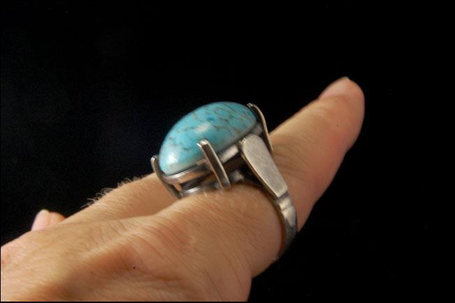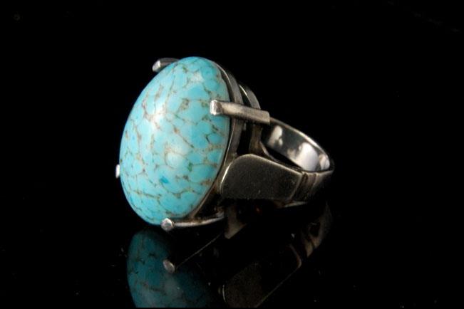 This is a very beautiful and very unique MODERNIST BLUE TURQUOISE CABOCHON 925 STERLING c. 1970 ring size 8 (weight 16.5g). The ring has a nice shape with a light blue Nevada turquoise cabochon (24 x 17 mm) and 925 sterling. The ring has a very extravagant and elegant feel to it. The ring is in very good condition.