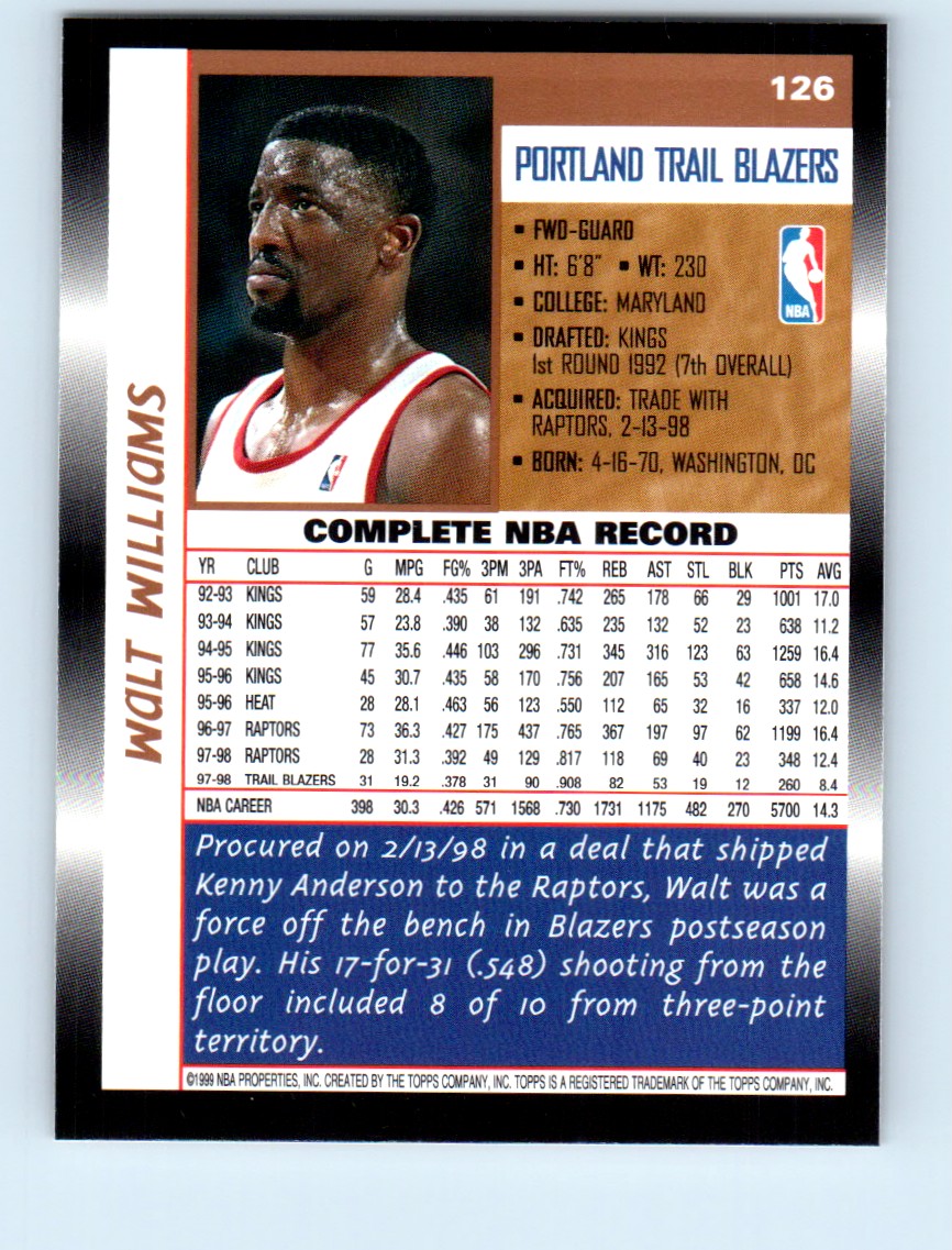 | 1998-99 Topps Walt Williams Portland Trail Blazers #126 |