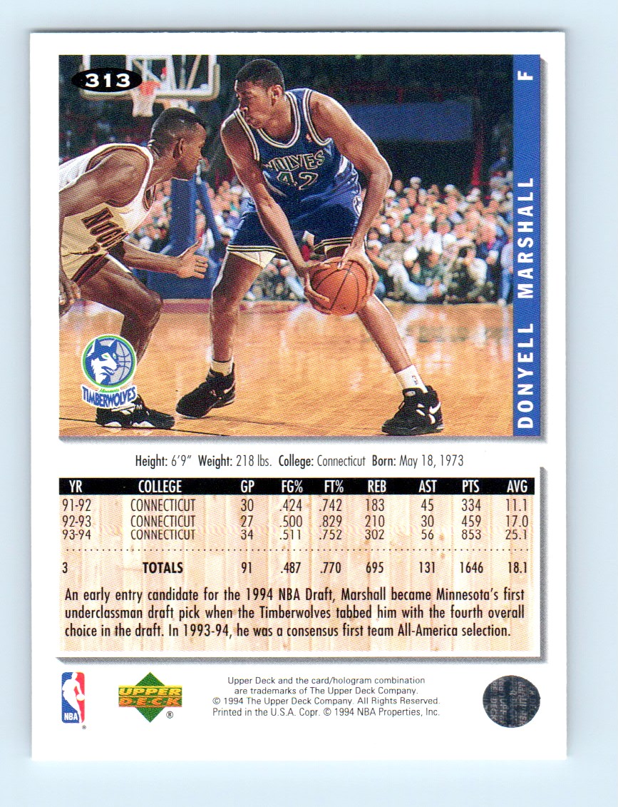 | 1994-95 Collector's Choice Donyell Marshall Rookie Minnesota Timberwolves #313 |