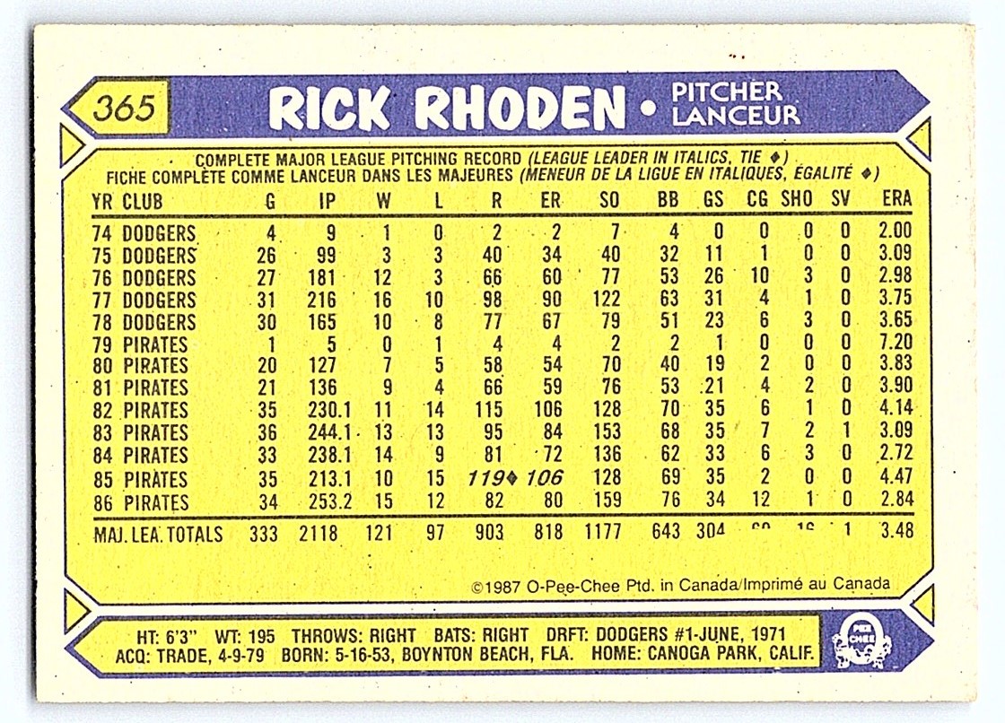 | 1987 O-Pee-Chee Rick Rhoden Pittsburgh Pirates #365 |
