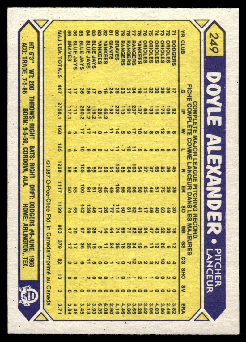 | 1987 O-Pee-Chee Doyle Alexander Atlanta Braves #249 |