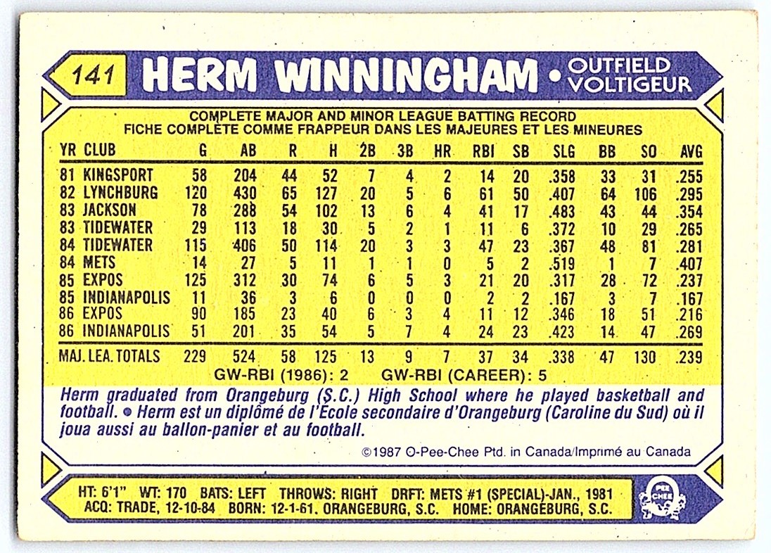 | 1987 O-Pee-Chee Herm Winningham Montreal Expos #141 |