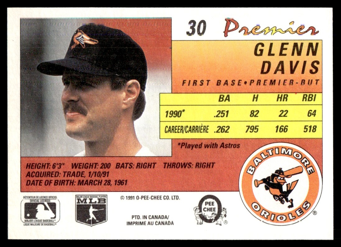 | 1991 O-Pee-Chee Premier Glenn Davis Baltimore Orioles #30 |