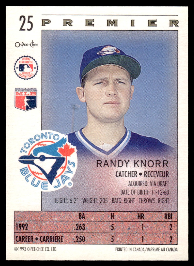 | 1993 O-Pee-Chee Premier Randy Knorr Toronto Blue Jays #25 |