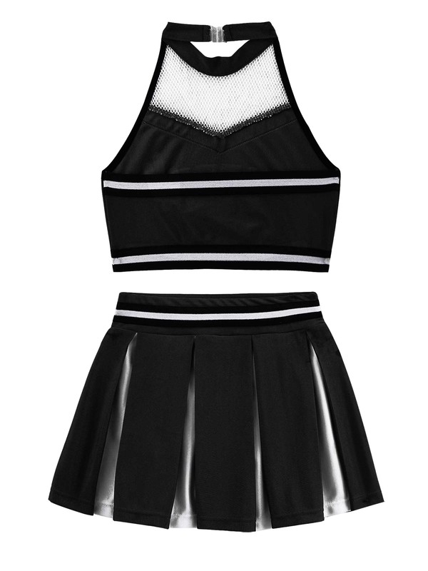The top features with sleeveless and halter neck with buckle, mesh patchwork style, letter “CHEERS” print in the front, backless design.