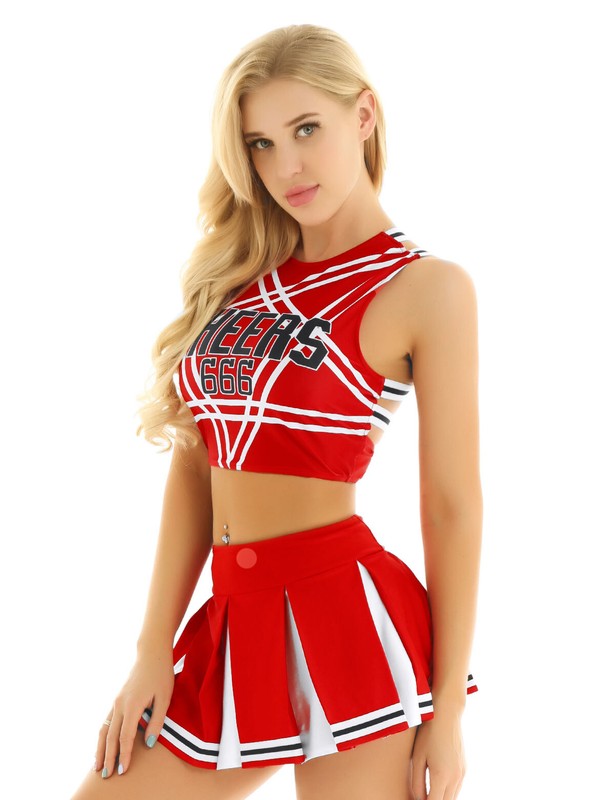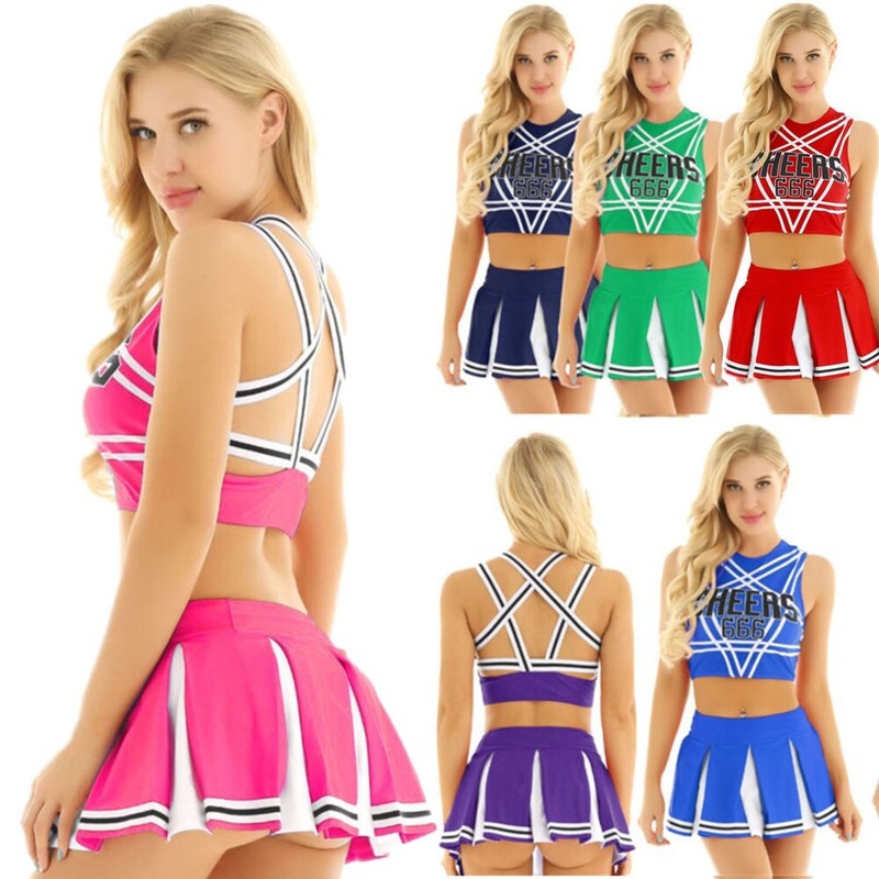 Women ladies cheerleading cosplay costume uniform set, pull on closure.