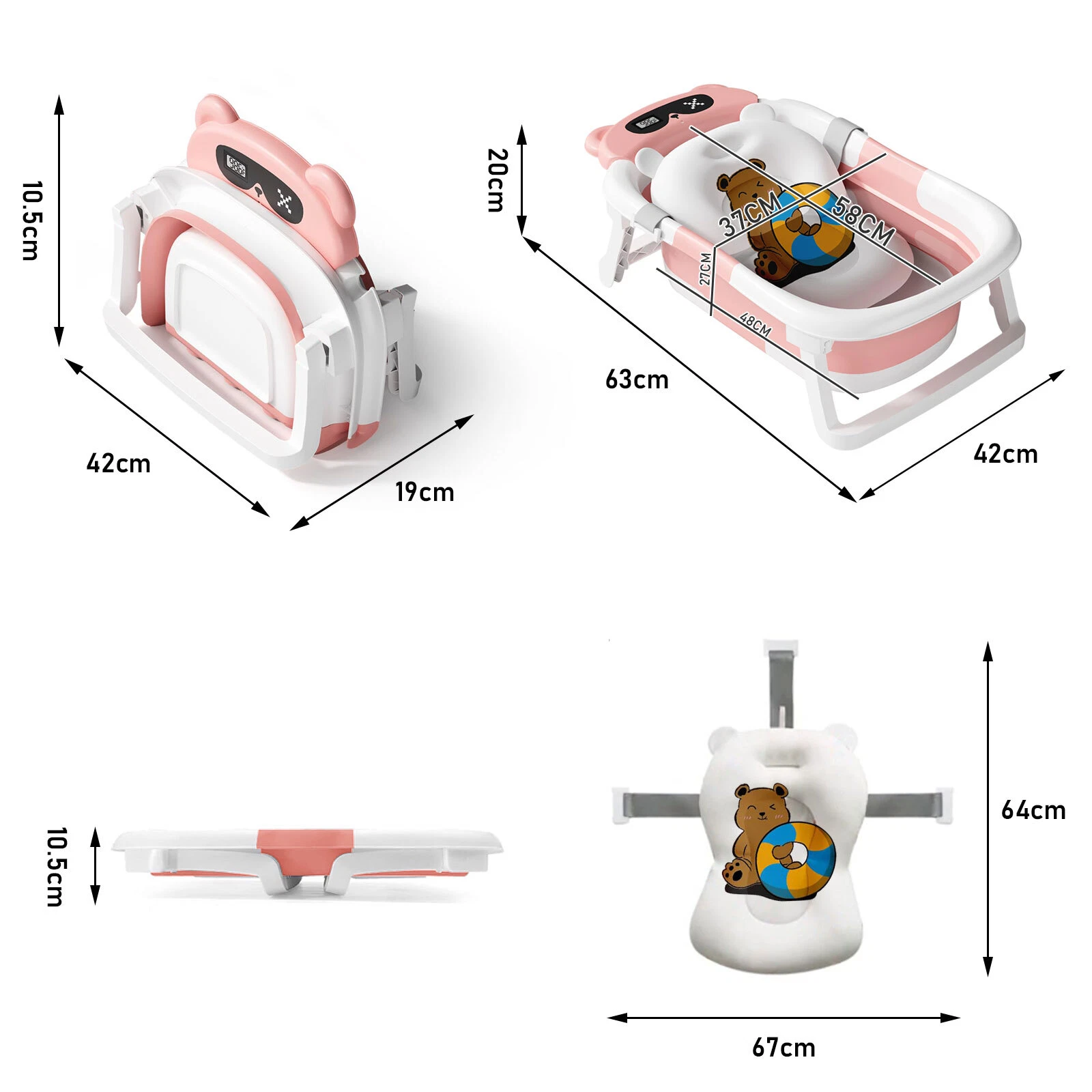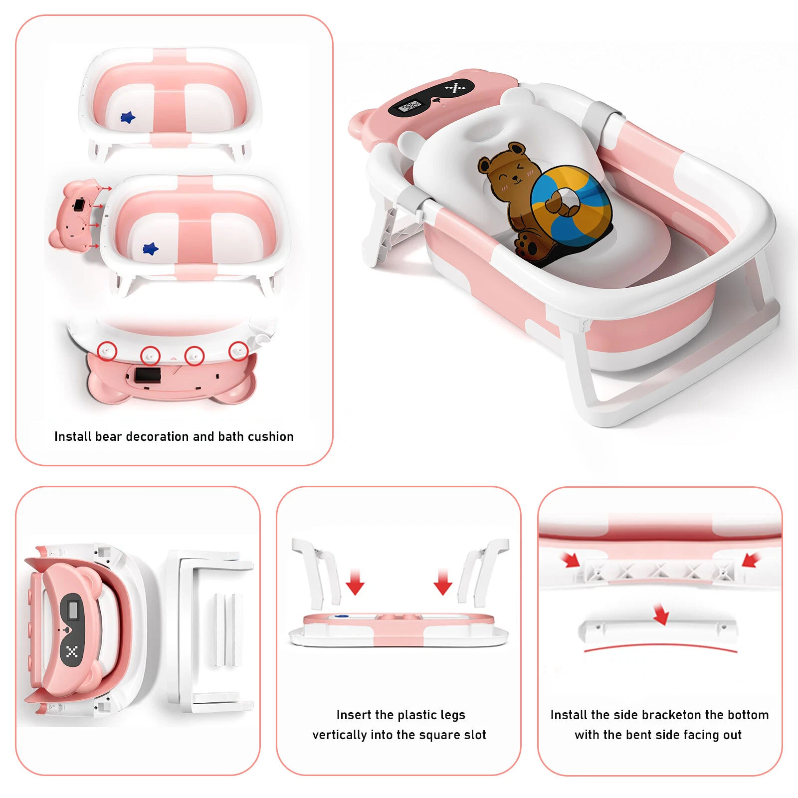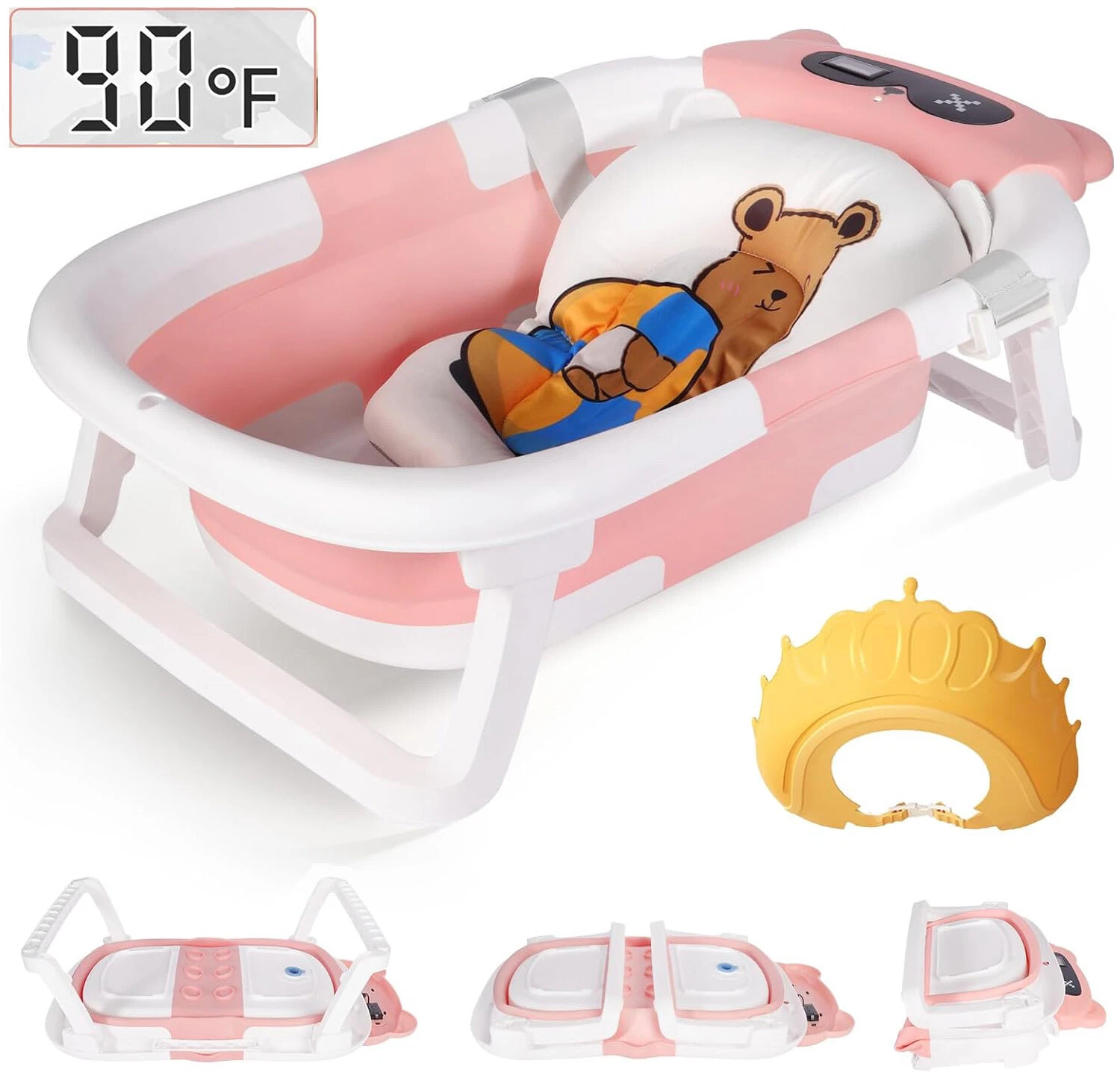 【Applicable Age】0-3 years old. Please use it under the care of an adult. Do not leave the baby alone to prevent drowning. 【Visible Temperature】Baby Bathtub is equipped with a temperature sensor, convenient for parents to adjust the water temperature in time. Ensure the safety and comfort of the baby when bathing. 【Soft Cushion】With soft cushion to protect baby's spine from shocks, and the baby bath more comfortable. Can float on the water surface of the bath, so that the baby does not cry or make trouble. 【High Quality Material】Baby Bathtub is made of PP+TPR environmentally friendly materials, non-toxic substances. It is the safest material for babies, please use it with confidence. 【Drainage Hole Design】 The bathtub is equipped with a drainage hole, allowing for easy water drainage and preventing water accumulation, ensuring a clean and hygienic bathtub. This design makes the bathing process more convenient and effortless. Specification: Material:PP+TPR Color:Pink / Green / Grey Package includes: 1 X Folding Baby Bathtub Please Note: