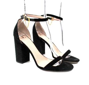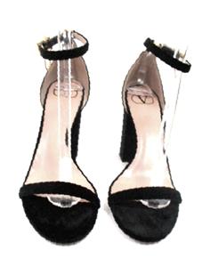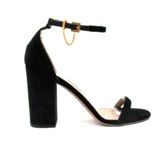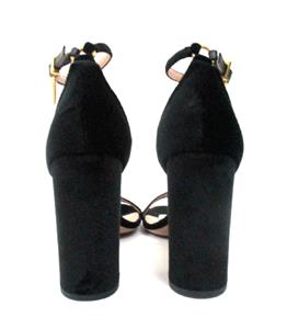 VALENTINO BLACK VELVET SANDALS WITH GOLD TONE HARDWARE, ADJUSTABLE BUCKLE ANKLE STRAPS WITH CHAIN DETAIL, APPROX. 4" COVERED BLOCK HEELS, LEATHER LINING & INSOLES (APPROX. 10.5"). MADE IN ITALY
