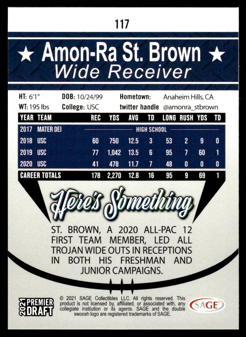 | 2021 SAGE Premier Draft Amon-Ra St. Brown Rookie USC Trojans #117 |