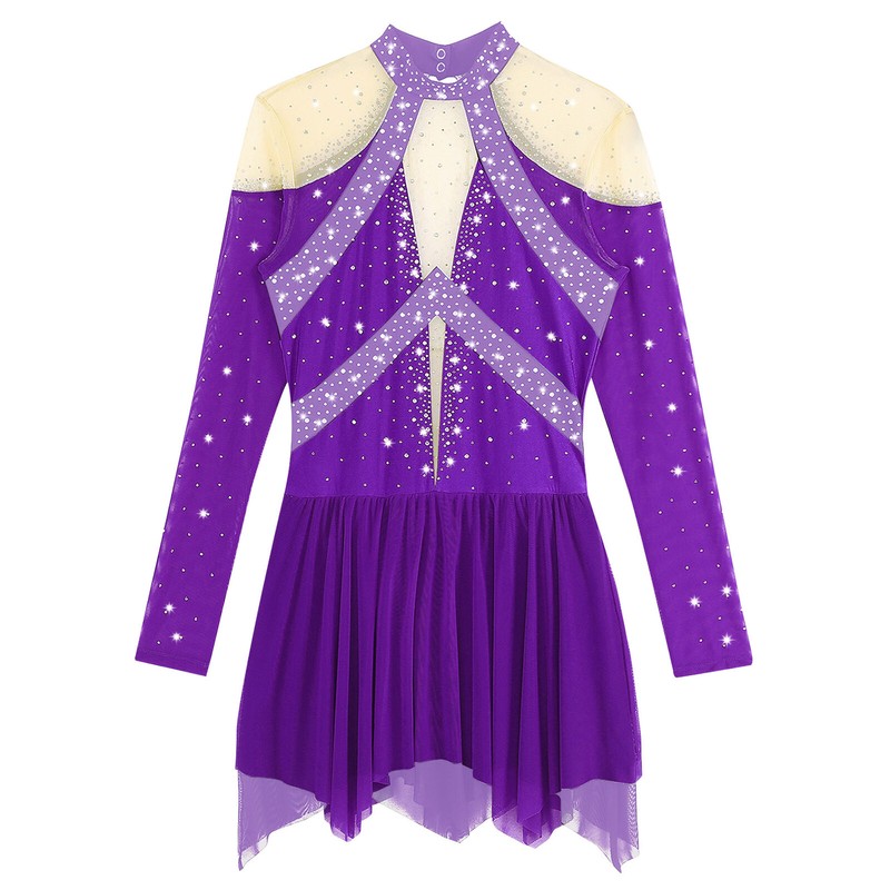 Color block and sheer mesh patchwork design with sparkling rhinestones to make you the spotlight in any performance.