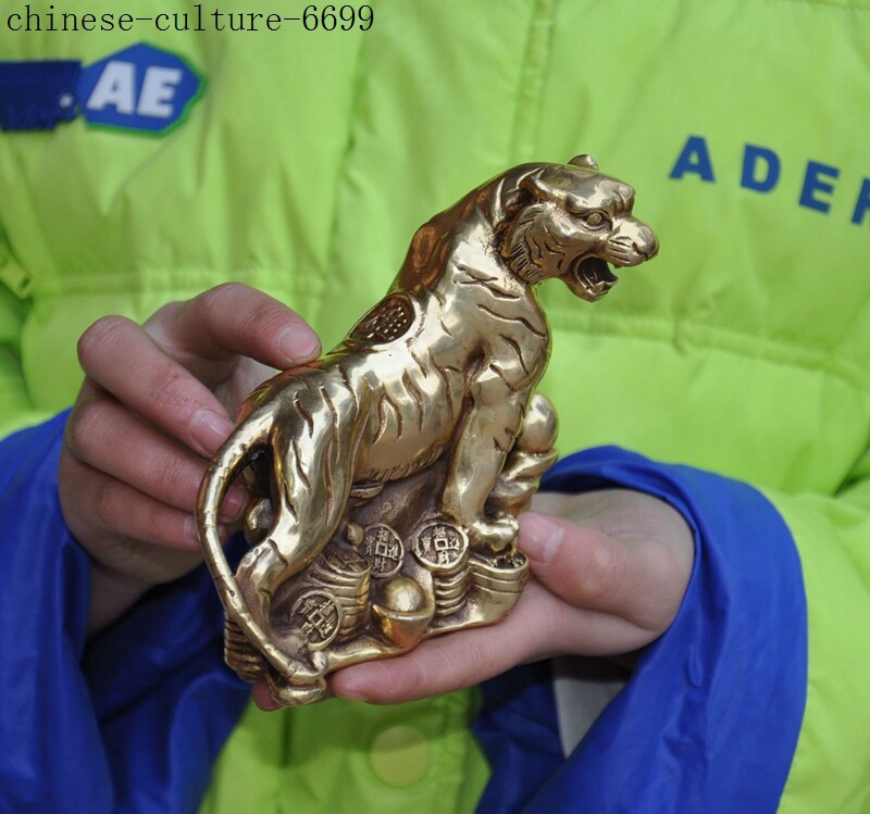 China Brass Ferocious Chinese Zodiac Animal Tiger Wealth Coin Feng Shui Statue