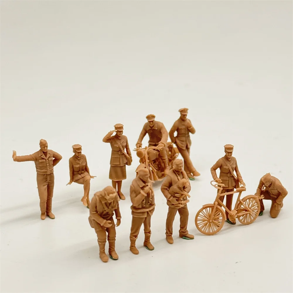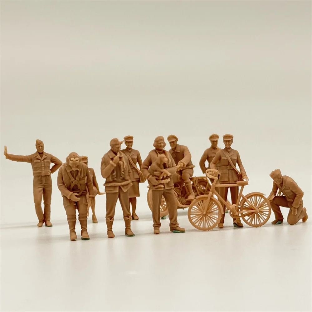 This 1/72-scale model kit of British pilots and ground crew members from World War II consists of 10 people, with vivid details. The characters include pilots and ground crew members. Their uniforms faithfully reproduce the style of the British army in World War II. The collar, pockets, buttons and hat decorations of the uniforms are clear. The pleats of the fabric fit the movements, such as the crisp military uniform of the standing commander and the natural pleats of the skirts and trousers of the sitting personnel. The postures are rich and diverse, featuring actions such as pilots holding helmets, ground crew pushing motorcycles (with visible wheel spokes and body details), carrying objects, and maintenance. There are also people leading dogs (the dogs are small in size but have a clear expression), and bicycles (with wheel rims and frame textures) and other props. Through various postures and equipment, the scenes of pilots preparing and ground crew collaborating at British air bases during World War II are vividly recreated. The miniature restores the historical atmosphere and showcases the various working conditions of British aviation personnel during the war.
