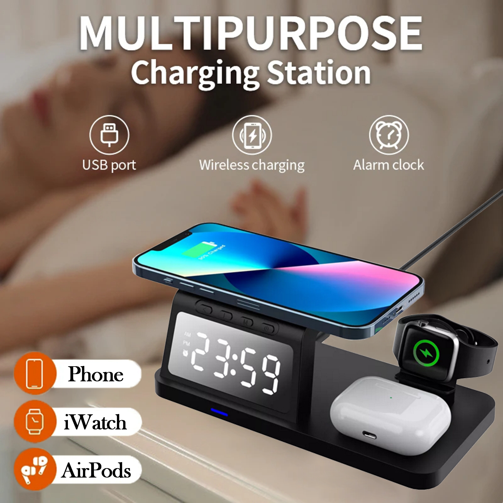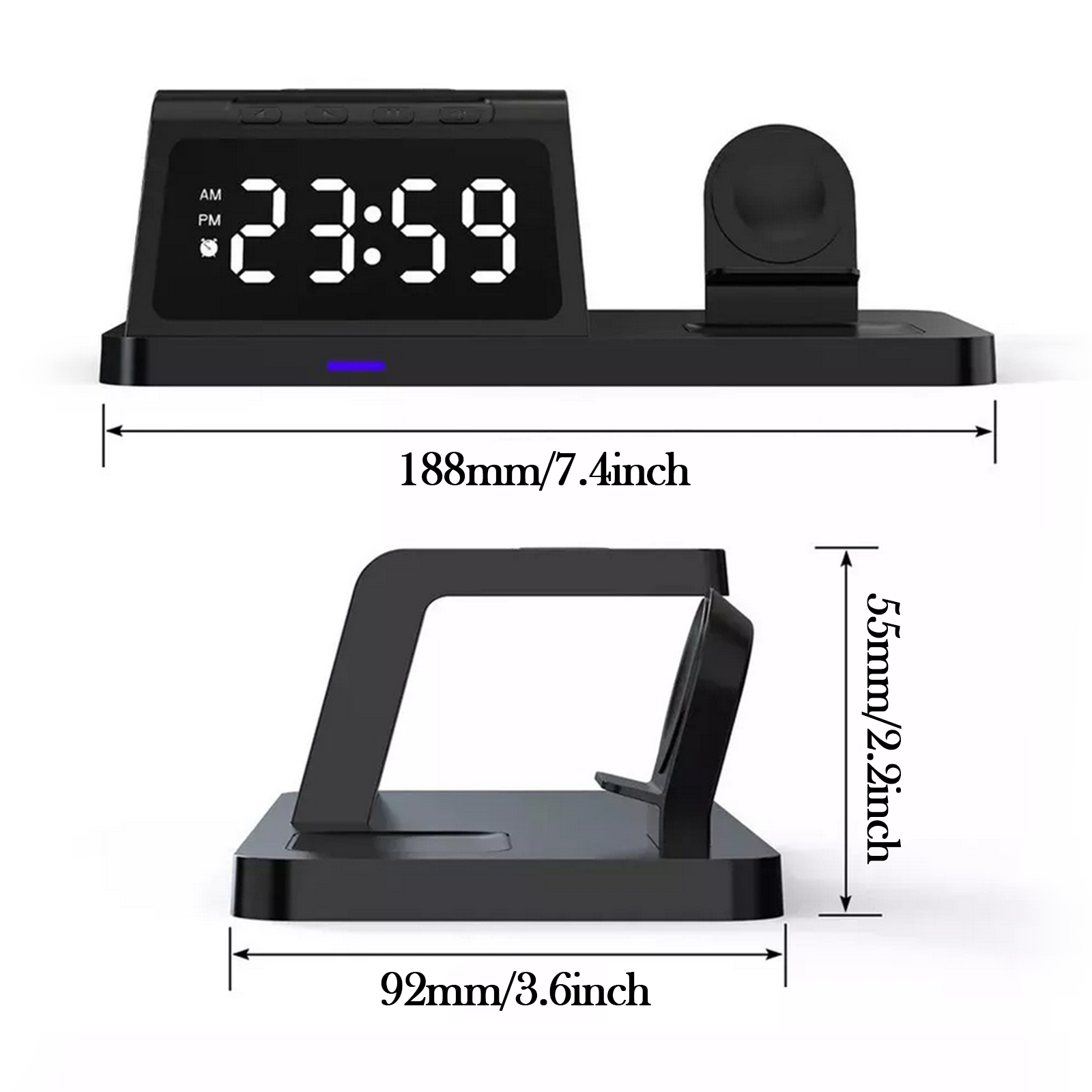 brightness. Dual-function as bedside charger + clock (saves