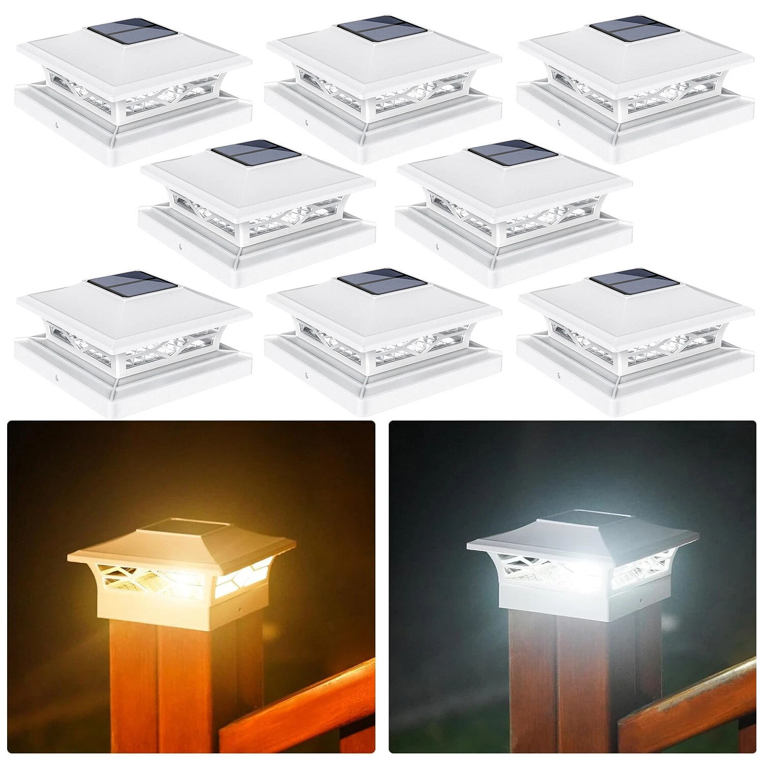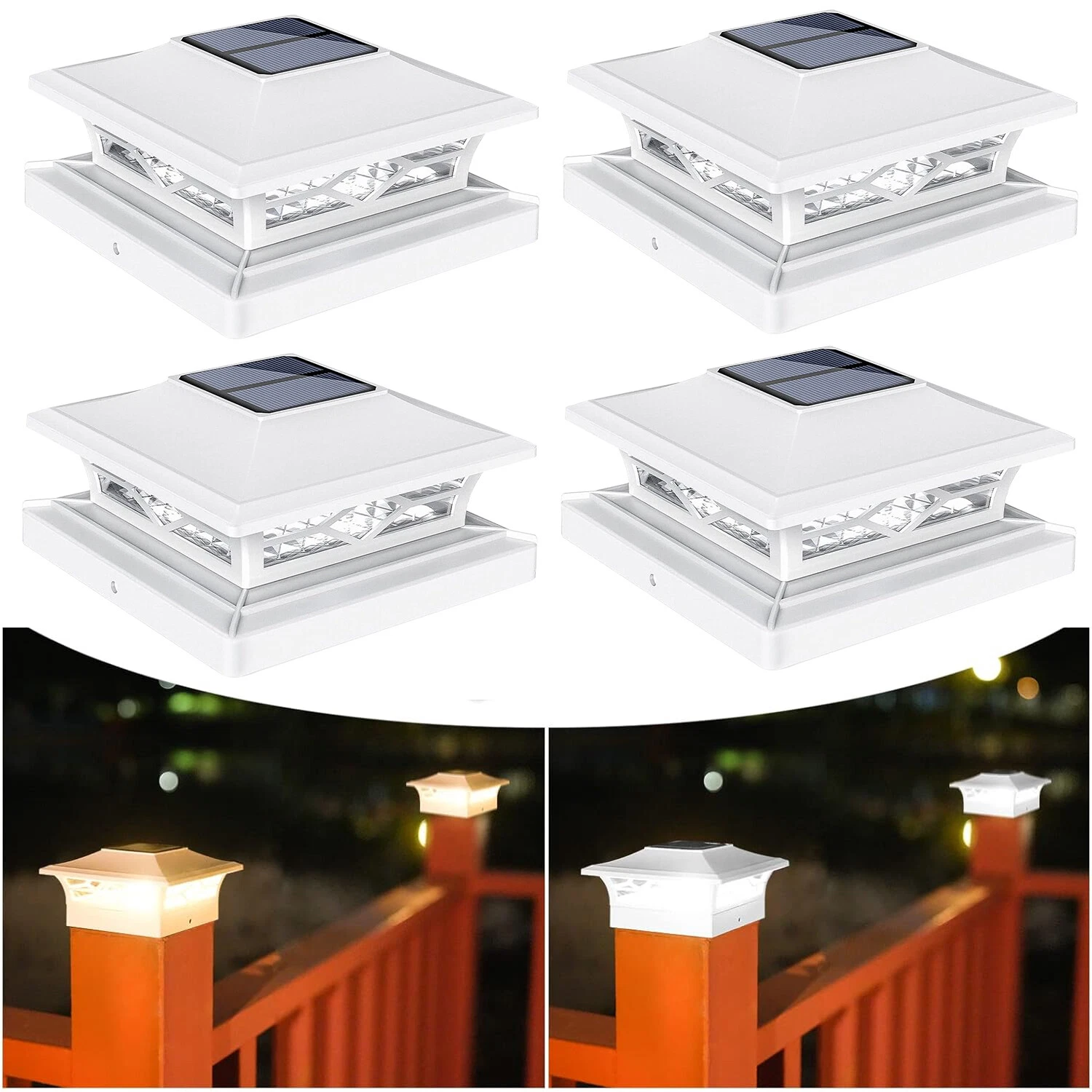 Solar post caps lights have 2 color temperatures: Warm white & cool white. With 10 led beads is capable of emitting 15 lumens of bright light at the start of dusk, making it perfect for outdoor lighting and garden decor, deck decor, fence decor, patio decor.