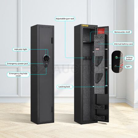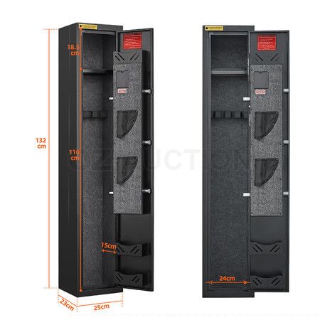 Reinforce the protection of your firearms with this Steel Gun Safe Box Case Cabinet Holder Locker. Boasting a spacious interior with dimensions of 132x25x23cm, it accommodates 4 rifles and 6 pistols, making your firearms neatly organised and easily accessible. Crafted with 1.6mm thick wall and door plates, our gun holder is designed to withstand even the most determined attempts at unauthorised access. Unlock the safe effortlessly using the intelligent 3- to 12-digit code system, or opt for the emergency key or an emergency energy box with a password backup option. Further, the automatic LED light illuminates the interior, ensuring visibility and convenience. Other highlights include the dual alarm system and optional silent mode, further enhancing security and practicality. Maximise organisation with the removable shelf and adjustable rifle racks, allowing you to customise the layout to suit your needs.