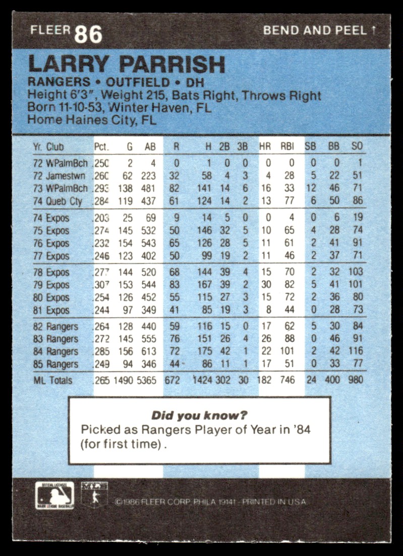 | 1986 Fleer Star Stickers Larry Parrish Texas Rangers #86 |