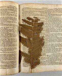 - There are several scraps of paper, pieces of fabric/ribbon and leaves tucked between the pages of the book - These were put there by a previous owner who saved them as mementos