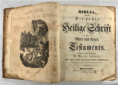 - The title page says, "Biblia, Das ist: Die ganze Heilige Schrift des Alten und Neuen Testaments, Nach der deutschen Uebersetzung D. Martin Luthers; Mit eines jeden Capitels kurzen Summarien, Auch beygefügten vielen aufs neue berichtigten Parallelen - Philadelphia - Herausgegeben von Wm. G. Mentz, Buchhandler, Nro. 53 Nord Dritte Strasse"