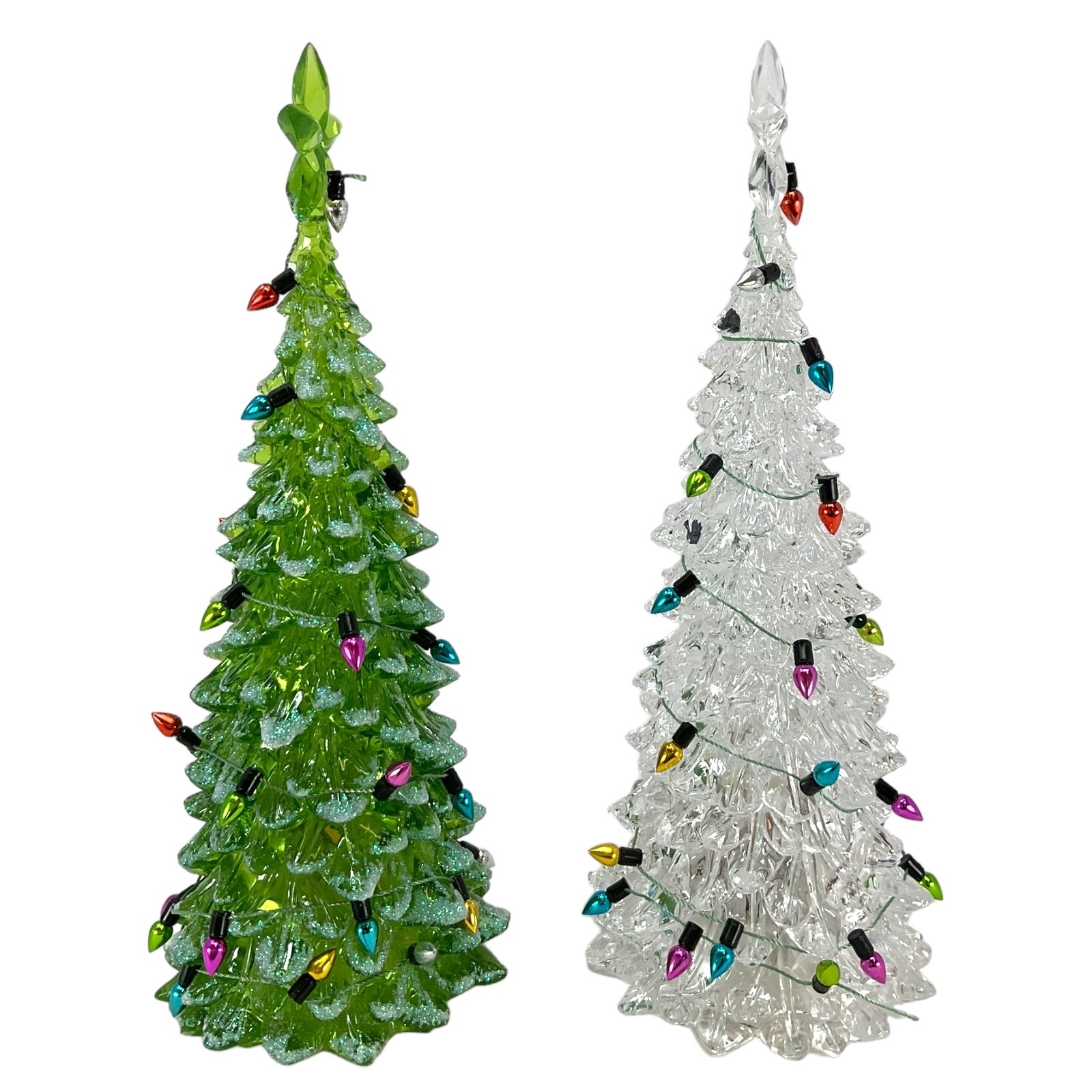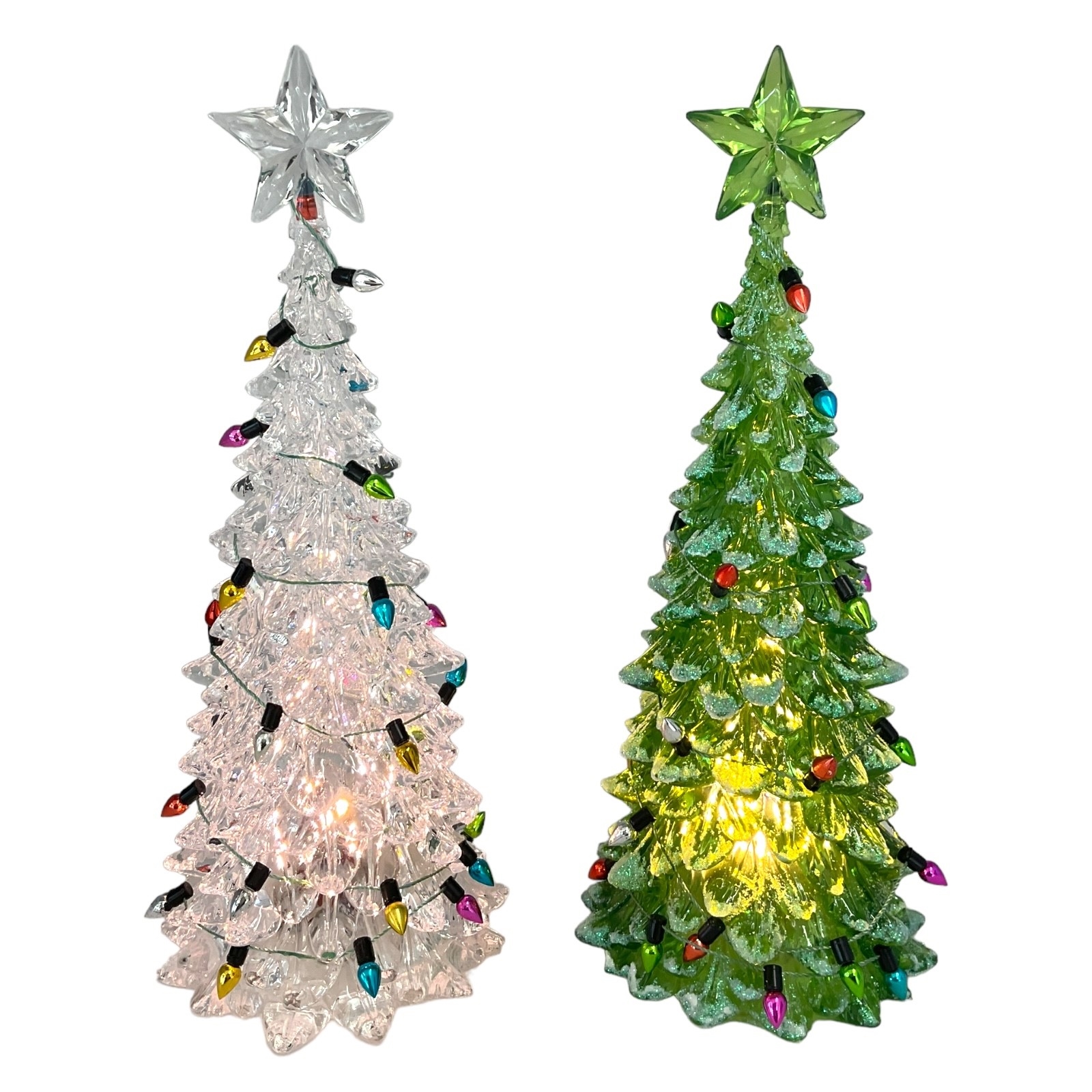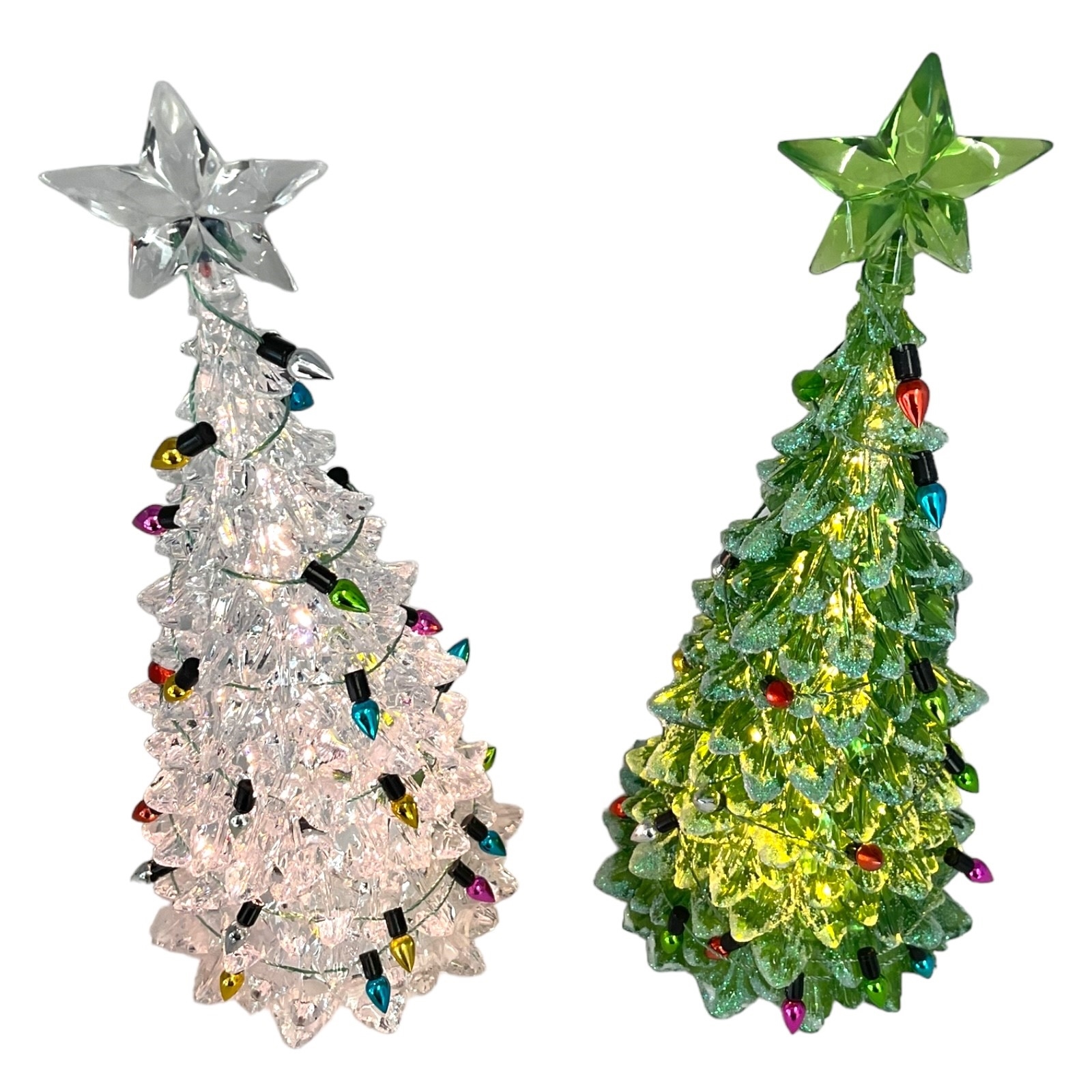 Lighted White or Green Christmas Tree Figurine. Made of Acrylic. 8 Inch Height x 3 Inch Length x 3 Inch Wide. Battery Operated, takes 3 LR44- Batteries INCLUDED. Keep away from water or damp locations.