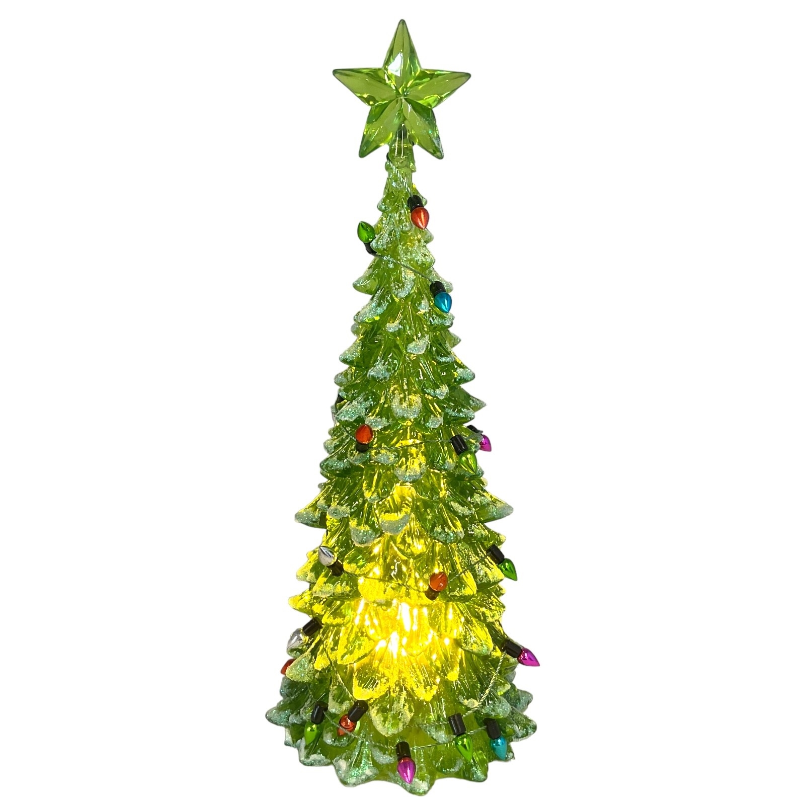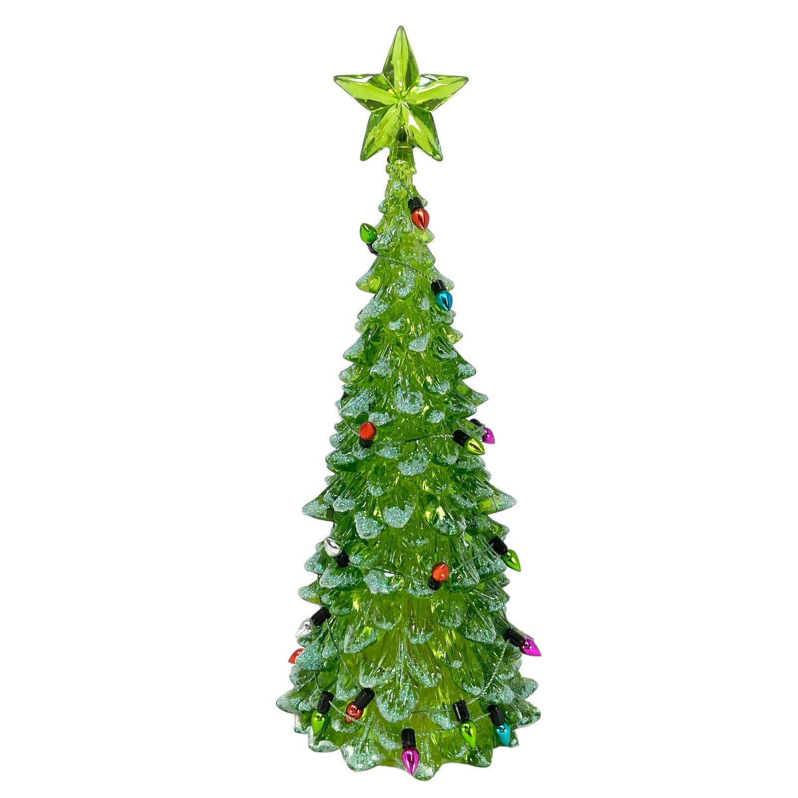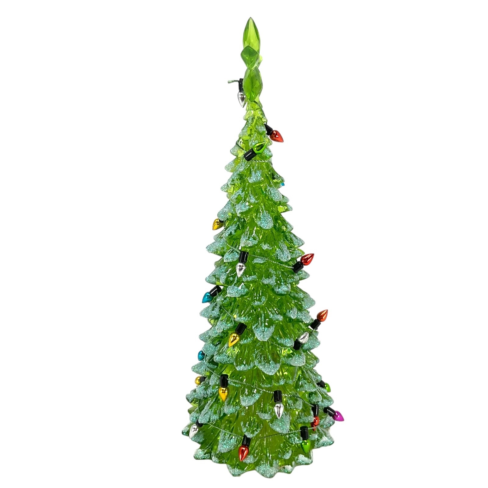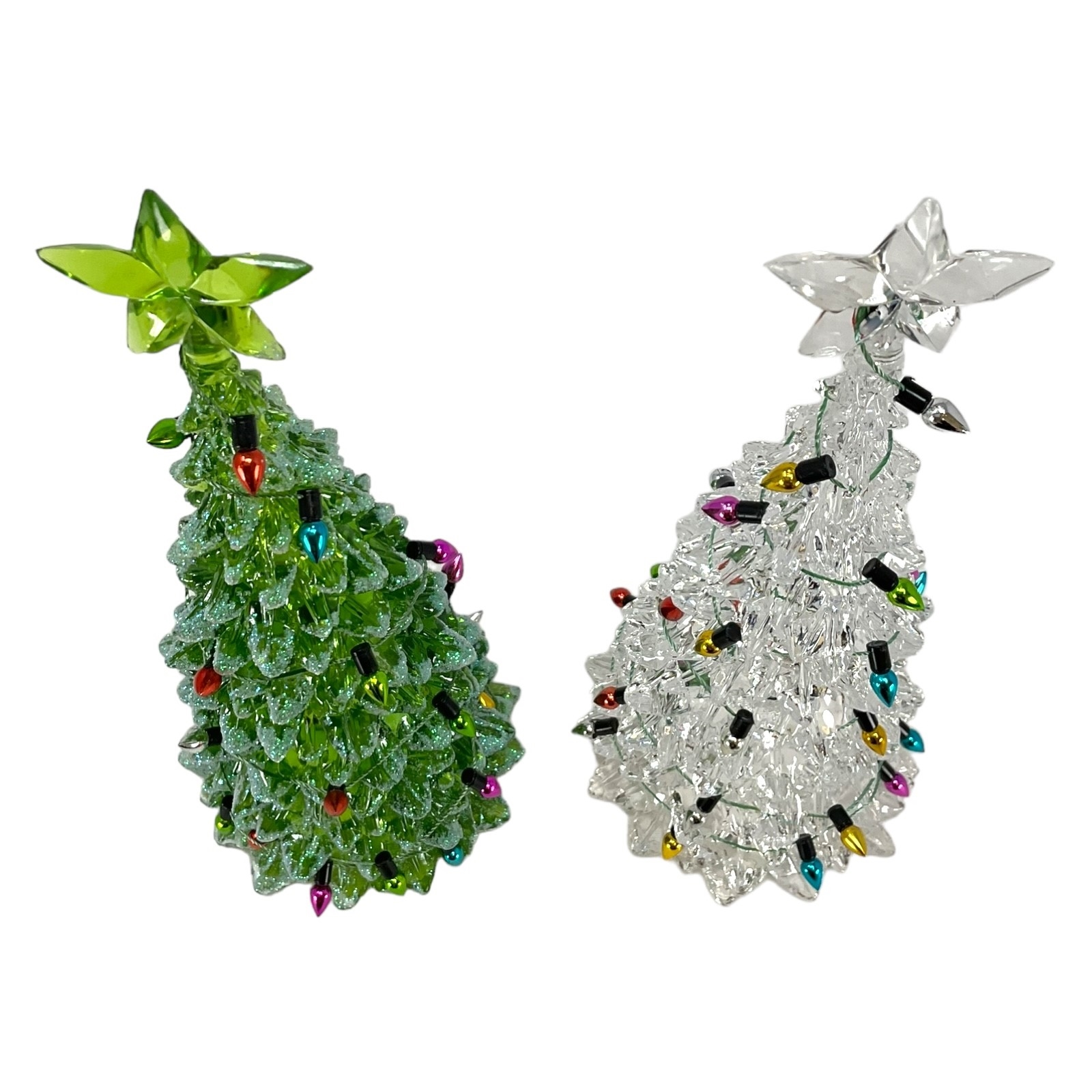 Lighted White or Green Christmas Tree Figurine. Made of Acrylic. 8 Inch Height x 3 Inch Length x 3 Inch Wide. Battery Operated, takes 3 LR44- Batteries INCLUDED. Keep away from water or damp locations.
