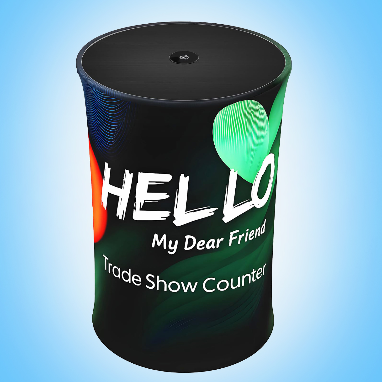 The custom-printed stretch fabric with integrated 360° internal LED lighting ensures high brand visibility, making it ideal for exhibitions, weddings, retail displays, or conferences. The wooden tabletop is 1.5cm (0.59in) thick, and the entire unit folds compactly into the included Oxford carrying bag for easy transport.