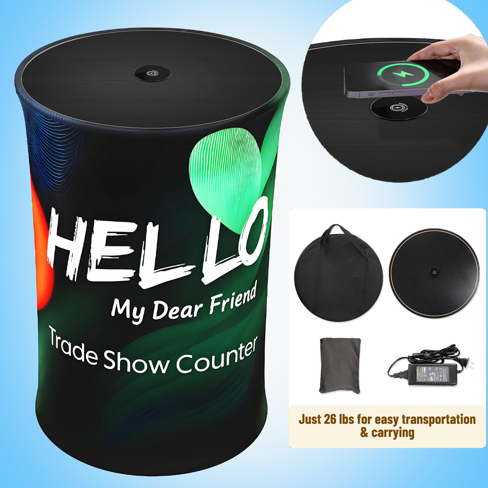 This portable LED backlit trade show counter combines functionality, mobility, and style. Featuring a lightweight 11.8kg (26lbs) aluminum pop-up frame, it sets up in seconds without tools. The tabletop supports up to 20kg (44lbs) and includes a built-in 15W Qi wireless charging pad to keep phones powered during events.