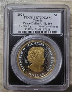 You are bidding on a Canada - 2024 Gold Plated Peace Dollar PCGS PR70DCAM UHR FDI Susan Blunt Signed