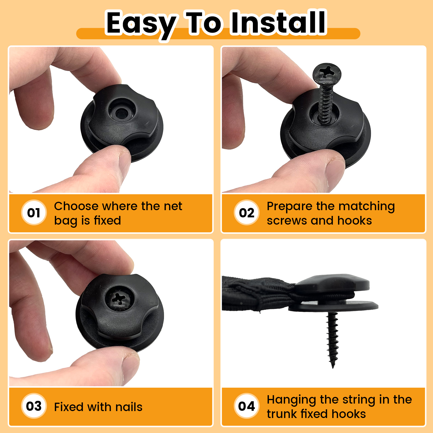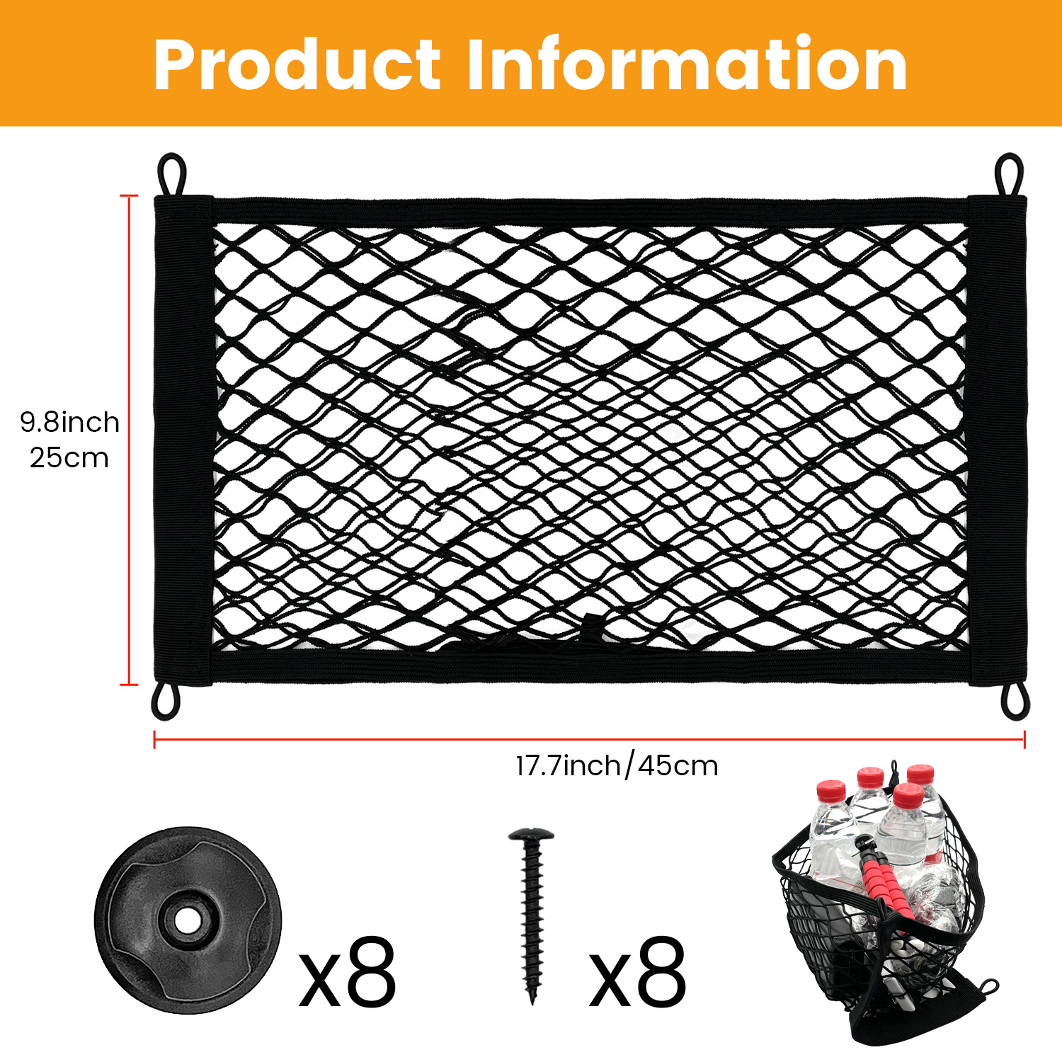 -This net can be fitted to the rear of the front and passenger seats, inside cupboards or garages.