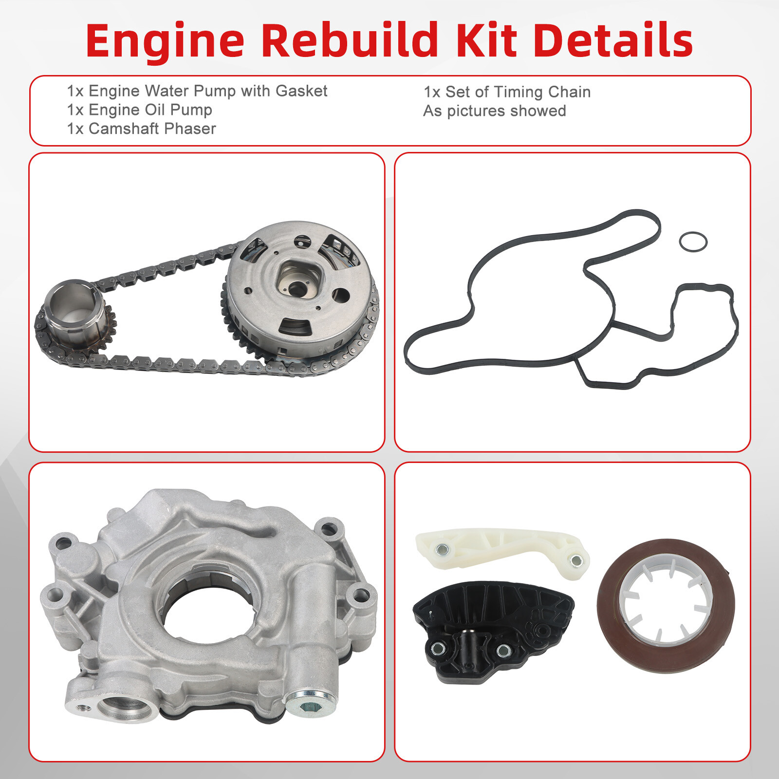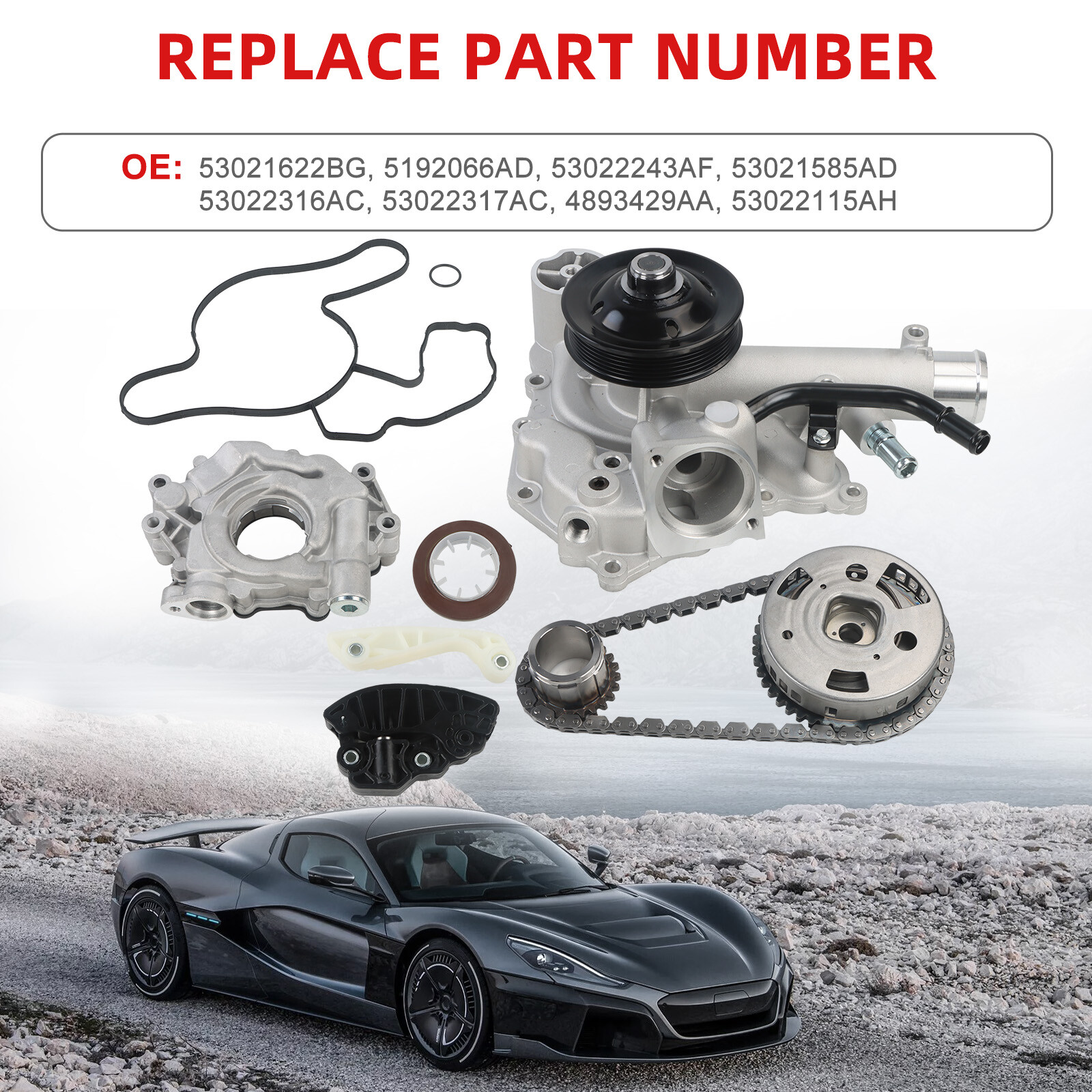 OEM Number 53021622BG 5192066AD 53022243AF 53021585AD 53022316AC 53022317AC 4893429AA 53022115AH Fitment: For 2009-2010 Dodge Ram 1500 5.7L For 2009-2010 Dodge Ram 2500 5.7L For 2009-2010 Dodge Ram 3500 5.7L For 2011-2015 Ram 1500 5.7L For 2011-2015 Ram 2500 5.7L For 2011-2015 Ram 3500 5.7L Timing Chain Set Include: Timing Chain Set Water Pump Oil Pump VVT Gear