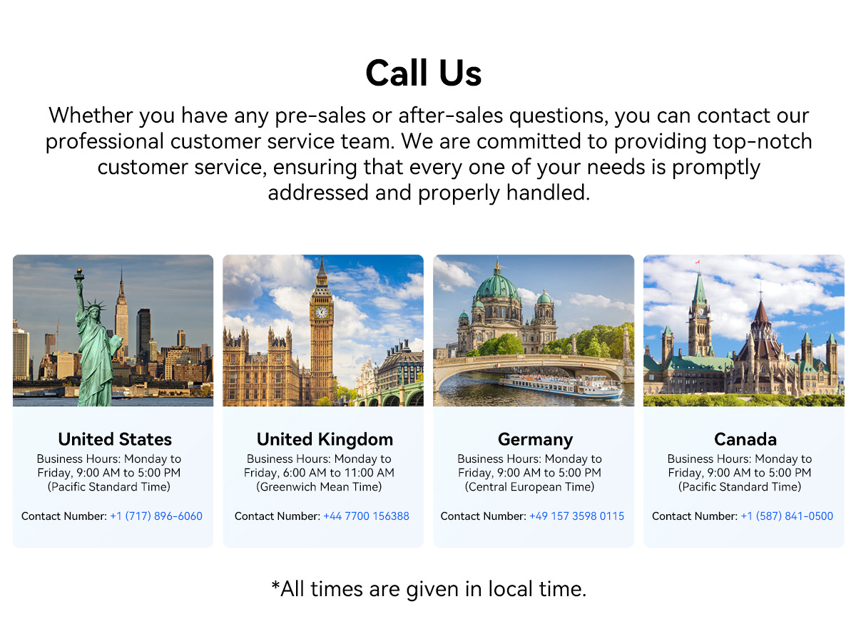 Normally,Our working schedule: (including hotline and online inquiry) UNITED STATES : PM 6:00~AM 2:00 FRANCE: AM 2:00~ AM:10:00 UK: AM 1:00~9:00 SPAIN : AM 2:00~ AM:10:00 GERMANY : AM 2:00~ AM:10:00 AU: AM 12:00~ PM:8:00