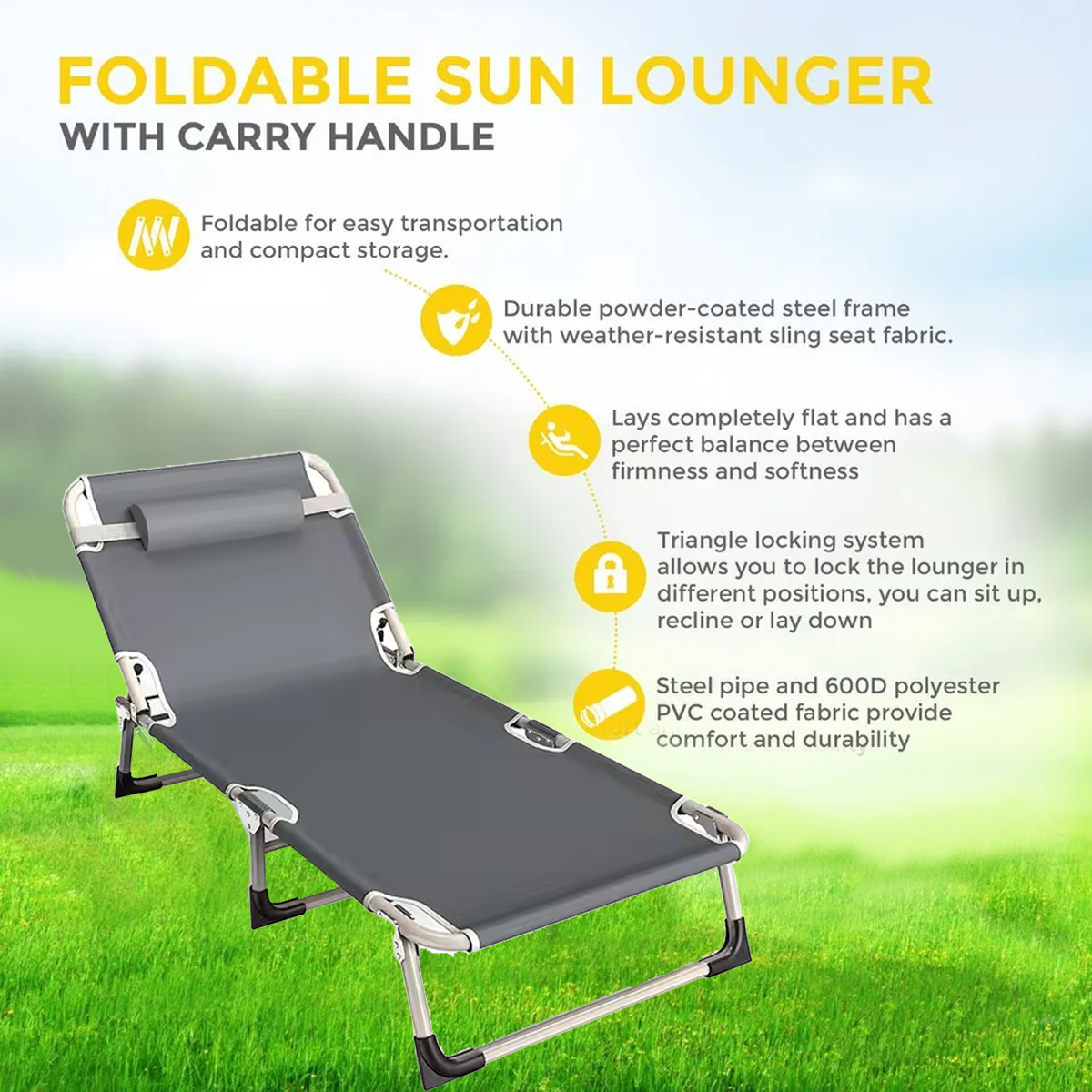 STABLE & COZY: This portable sun lounger is made of powder coated steel frame guarantees a stable standing and the 600D Oxford cloth with double elastic rope suspension system provides a comfortable yet strong support.