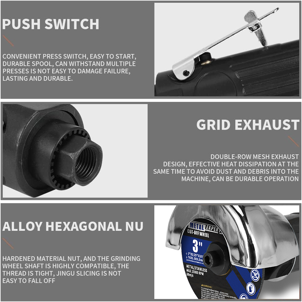 Excellent Quality: cut off tool air tools adopts die-cast aluminum body, air knife is wear-resistant and anti-oxidation, fine workmanship, and long service life. Mini air angle grinder is compact, lightweight, easy to handle, and provides great power and durability for all of your applications.