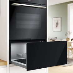 Keep trays, racks, and plates neatly stored in the full-width pull-out drawer below the ovens.