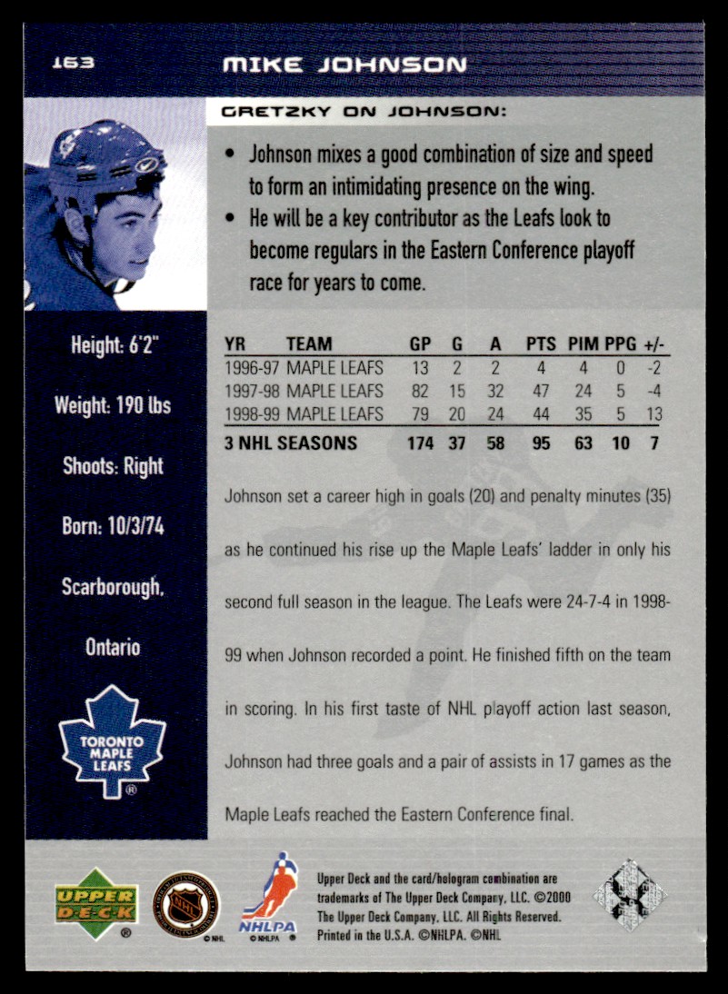| 1999-00 Upper Deck Wayne Gretzky Mike Johnson Toronto Maple Leafs #163 |
