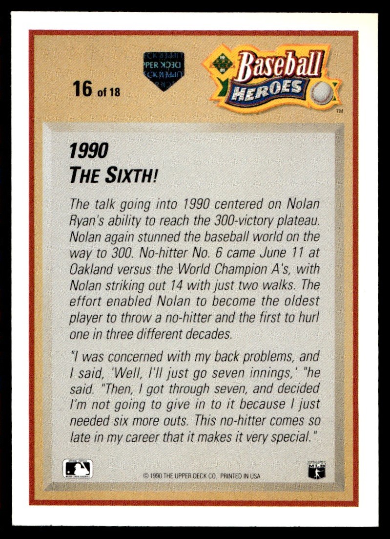 1991 Upper Deck Baseball Heroes Nolan Ryan Nolan Ryan Texas Rangers #16