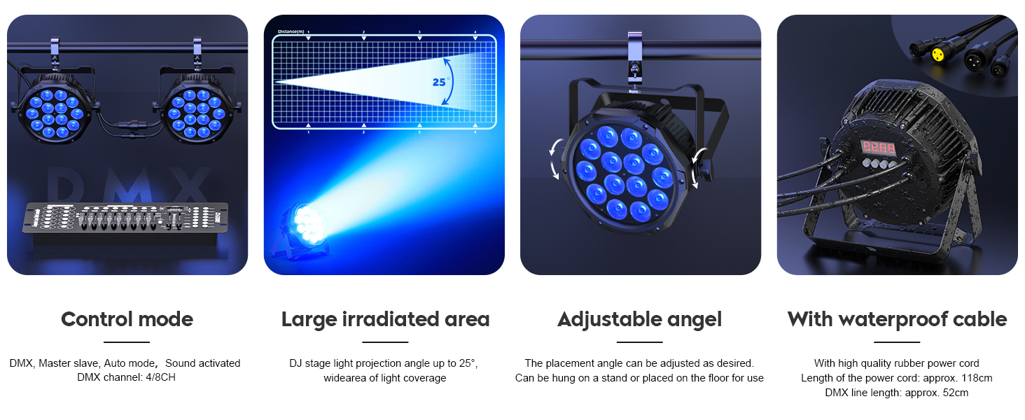 3. Different operation modes, stage lighting with DMX512, self-propelled, sound-activated, master/slave mode. It supports professional 4/8 DMX channels with built-in smooth electronic dimming 0-100% adjuster.