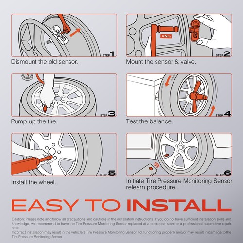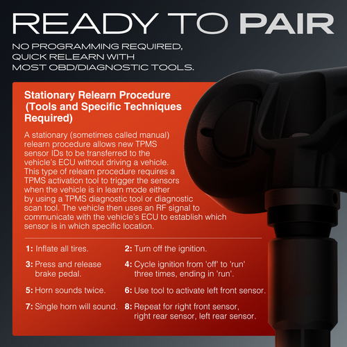 The sensors are pre-programmed and require a relearn procedure, select method: [Auto/OBDII/Stationary]. To identify how your own vehicle relearns, check the compatibility chart below, contact us with your vehicle's info, or read your vehicle owner's manual.