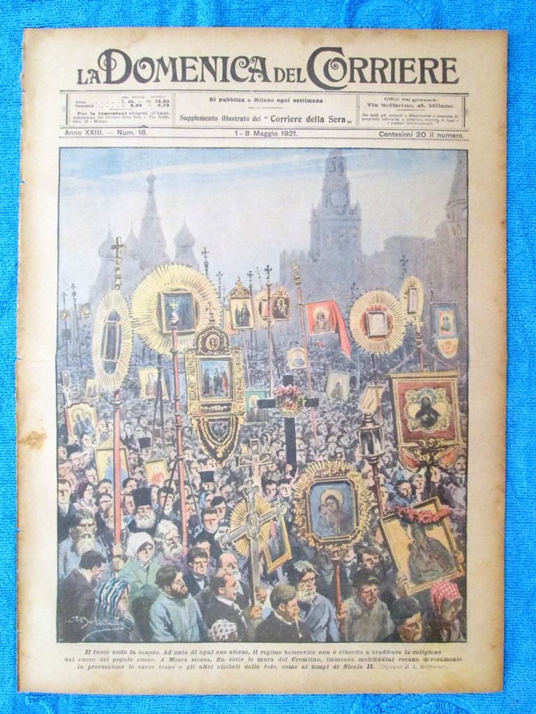 Il fuoco sotto la cenere. Ad onta di ogni suo sforzo, il regime bolscevico non è riuscito a sradicare la religione dal cuore del popolo russo. A Mosca stessa, fin sotto le mura del Cremlino, immense moltitudini recano devotamente in processione le sacre icone e gli altri simboli della fede, come ai tempi di Nicola II