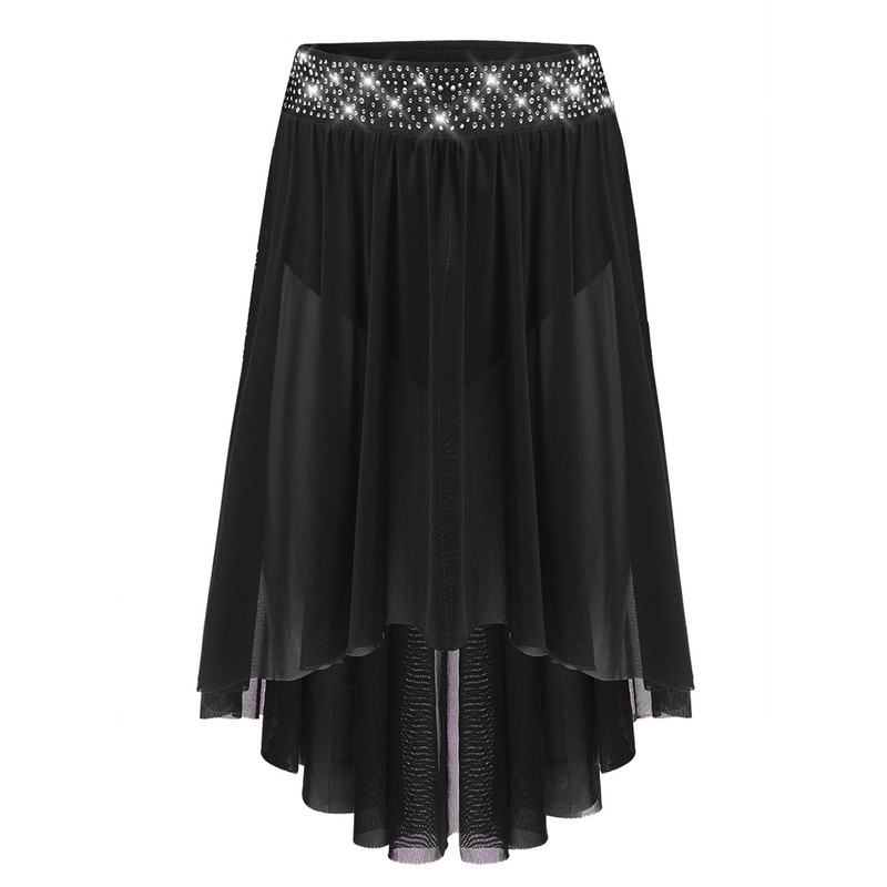 The asymmetrical style of the skirt is a trendy fashion element, creating a dynamic and stylish look that keeps up with the latest dancewear trends.