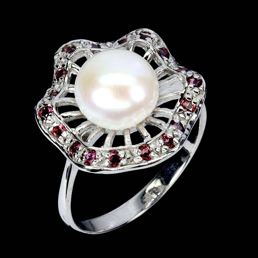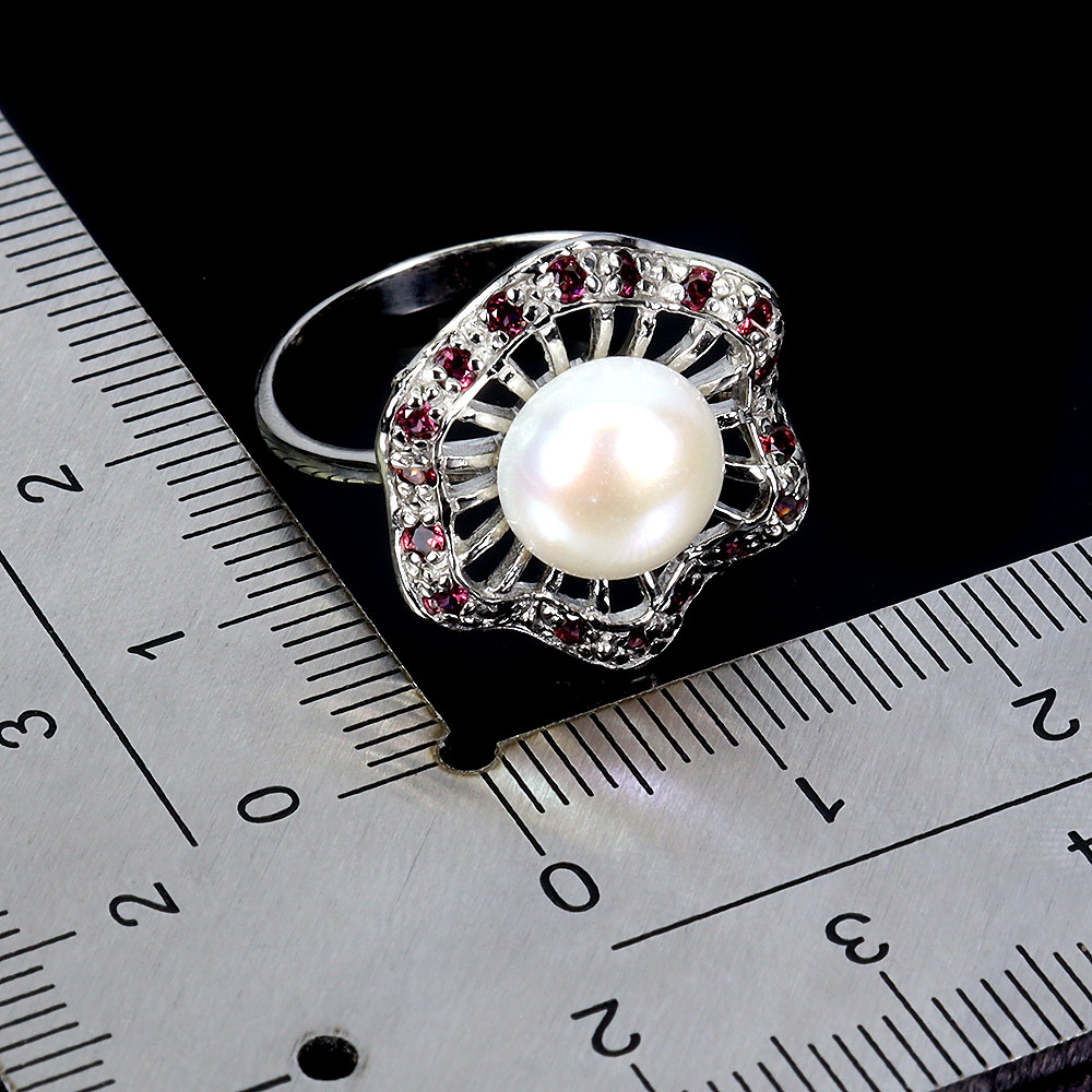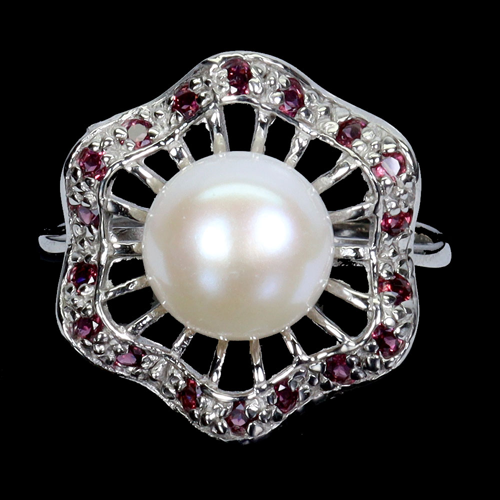 925 Sterling Silver Ring Round Rhodolite Pearl Natural Gemstone Jewelry Size 8