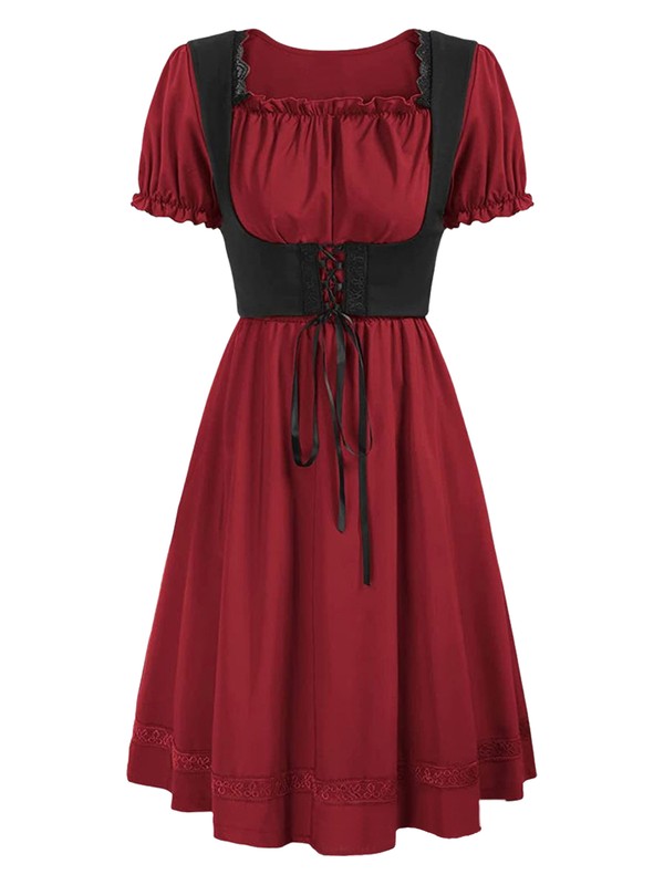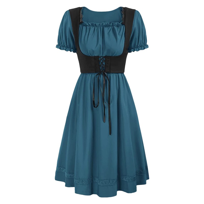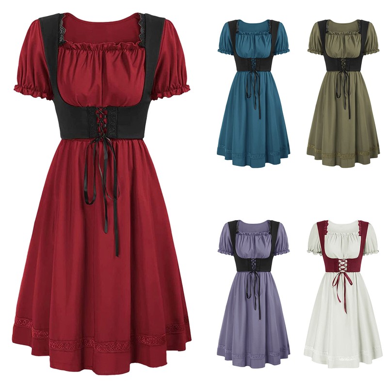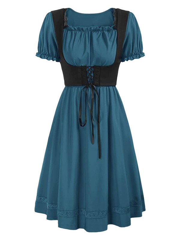 Womens Dancewear Retro Dresses Lace-up Dress Vintage Medieval Short Sleeve Set