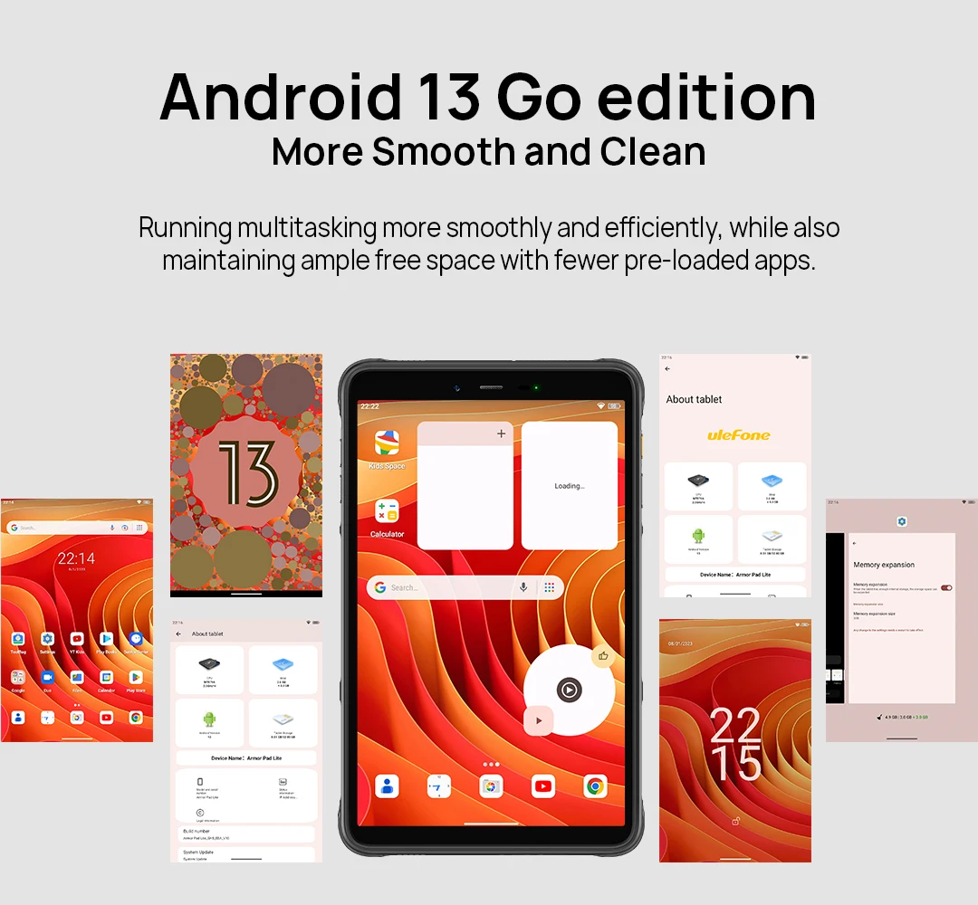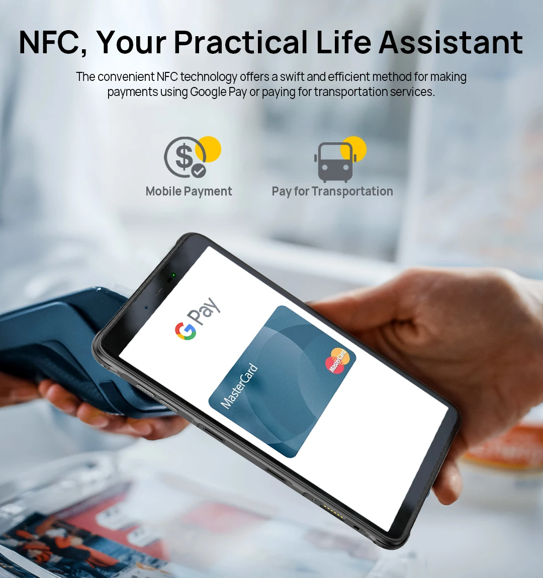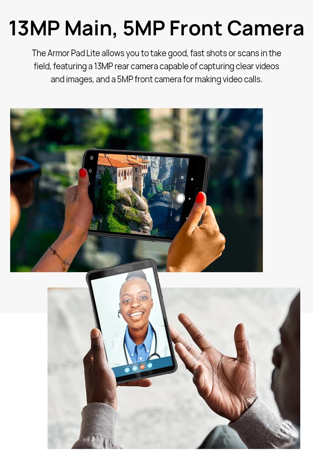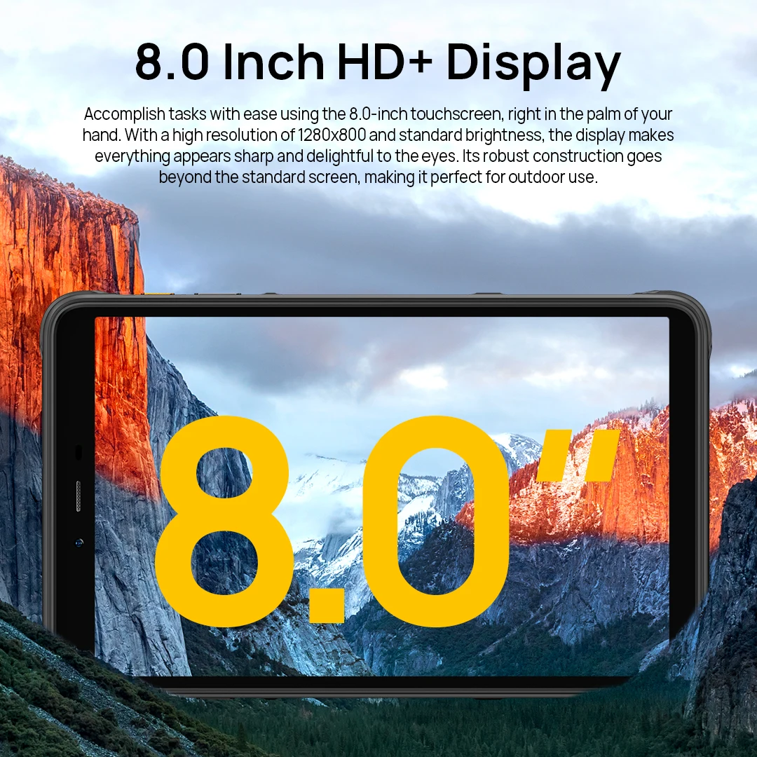 Features: ●IP68 & IP69K Protection, Waterproof/Shockproof/Dustproof ●MIL-STD-810H Certified ●Android 13 Go edition ●7650mAh Battery ●8.0-inch HD+ Display ●Dual Stereo Speakers ●500 nits Brightness ●3GB RAM + 32GB ROM ●13MP Main Camera ●2.4GHz & 5GHz WiFi ●GPS GLONASS BeiDou Galileo ●uSmart Expansion Connector ●Custom Key ●NFC + Google Pay