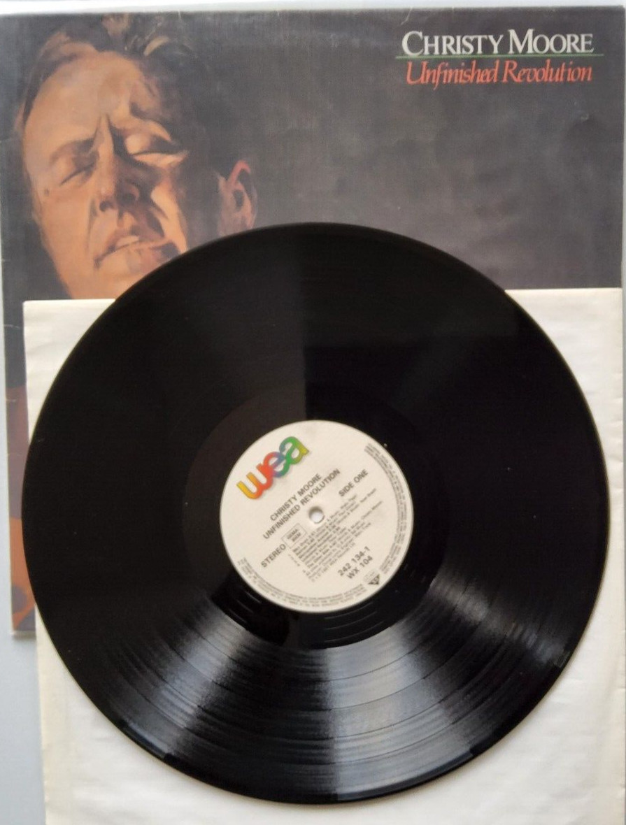 Released in 1987, Unfinished Revolution finds Irish folk icon Christy Moore at a politically reflective and musically expansive point in his career. The album blends traditional folk instrumentation with contemporary themes, addressing issues of social justice, identity, and resistance. Tracks like “Biko Drum” and the title song “Unfinished Revolution” highlight Moore’s commitment to activism through song, while “Messenger Boy” and “Tribute To Noel Brazil” offer more personal, introspective moments. Issued on WEA and housed in a printed sleeve, this LP captures the voice of a generation with clarity and conviction.