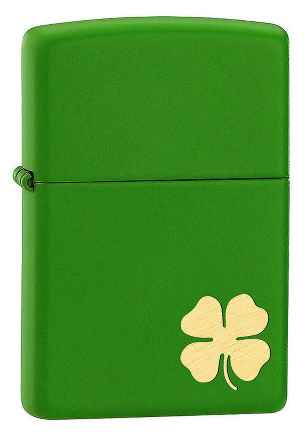 Zippo Matte Clover Windproof Lighter catch the luck of the Irish with this green matte lighter. A four-leaf clover is laser engraved at the bottom of this lighter. Comes packaged in a gift box. The clover lighters have a standard case shape featuring rounded corners and top with a flat bottom. A five-barrel hinge joins the top and the bottom. The clover lighters have a standard insert with 16 holes in the chimney (8 per side). The bottom is stamped with Zippo logo from the period authenticates this lighter as genuine Zippo.