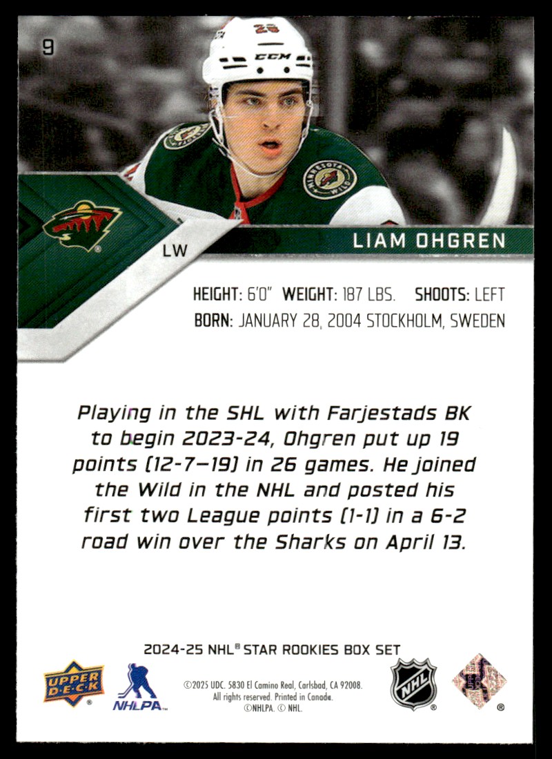 | 2024-25 Upper Deck NHL Star Rookies Box Set Liam Ohgren Rookie Minnesota Wild #9 |