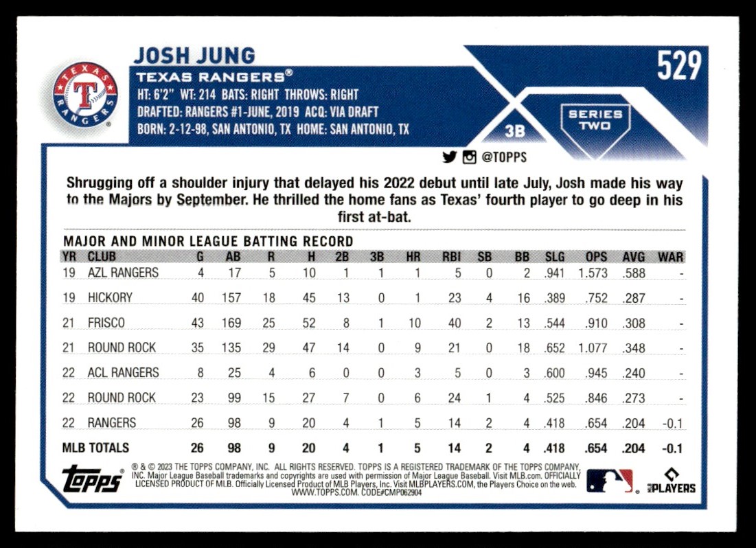 2023 Topps Josh Jung/// Rookie Texas Rangers #529