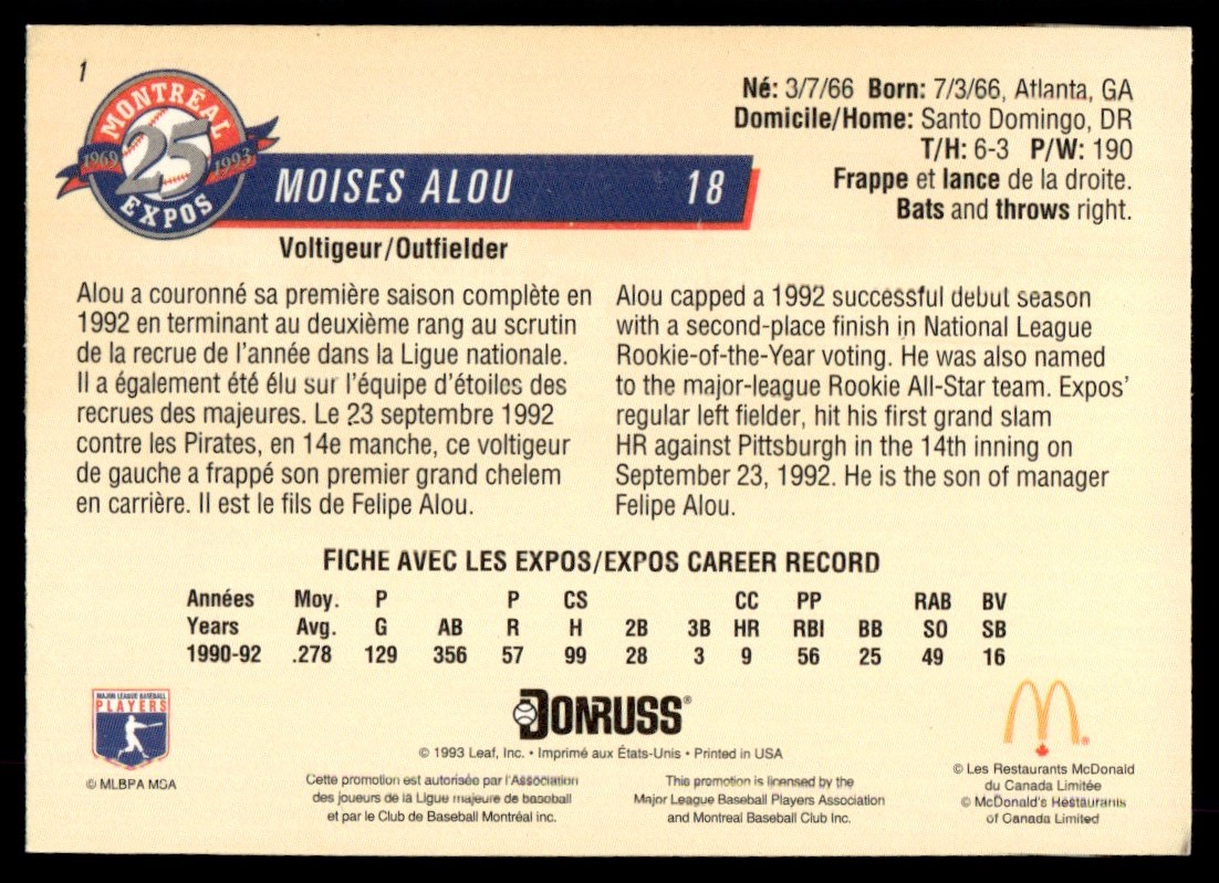 | 1993 Donruss McDonald's Montreal Expos 25th Anniversary Moises Alou #1 |