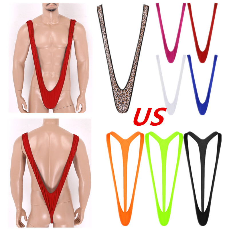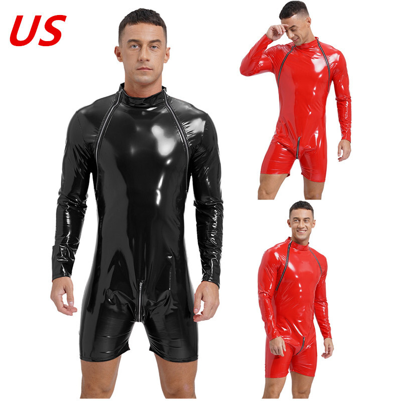 Patent leather lingerie jumpsuit for men, sleeveless, backless, butt flaunting bodysuit with bulge pouch.